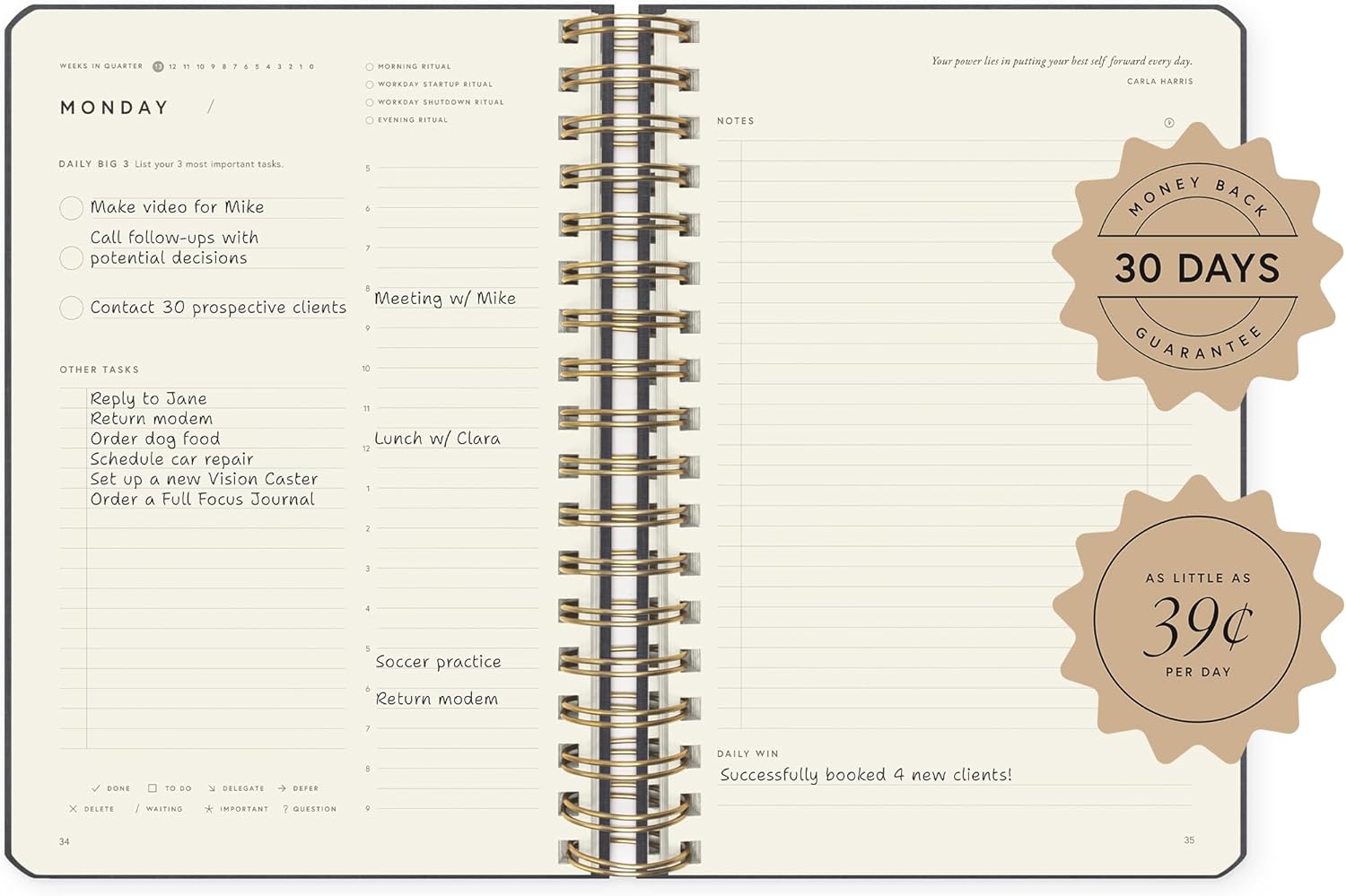 - 📈 TRACK YOUR PROGRESS & STAY FOCUSED – Utilize the weekly and quarterly review templates, alongside daily task lists, to seamlessly bridge the gap between your everyday actions and your long-term ambitions. With your priorities consistently in sight, you won’t be derailed by life’s daily demands. The Full Focus Planner empowers you to filter through the noise of the urgent and focus on what truly matters, ensuring steady progress toward your most important goals.