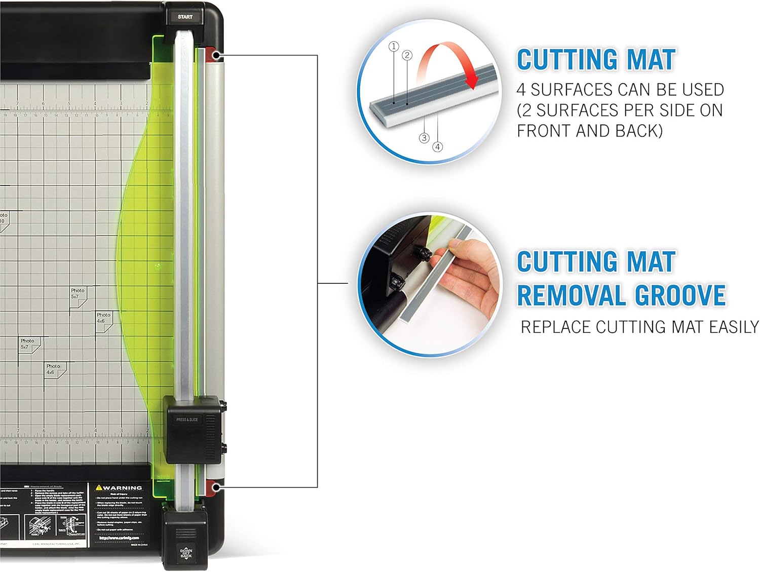 - Blade length: 15", premium steel. Extra cutting mat, straight blade, and perforating blade included.