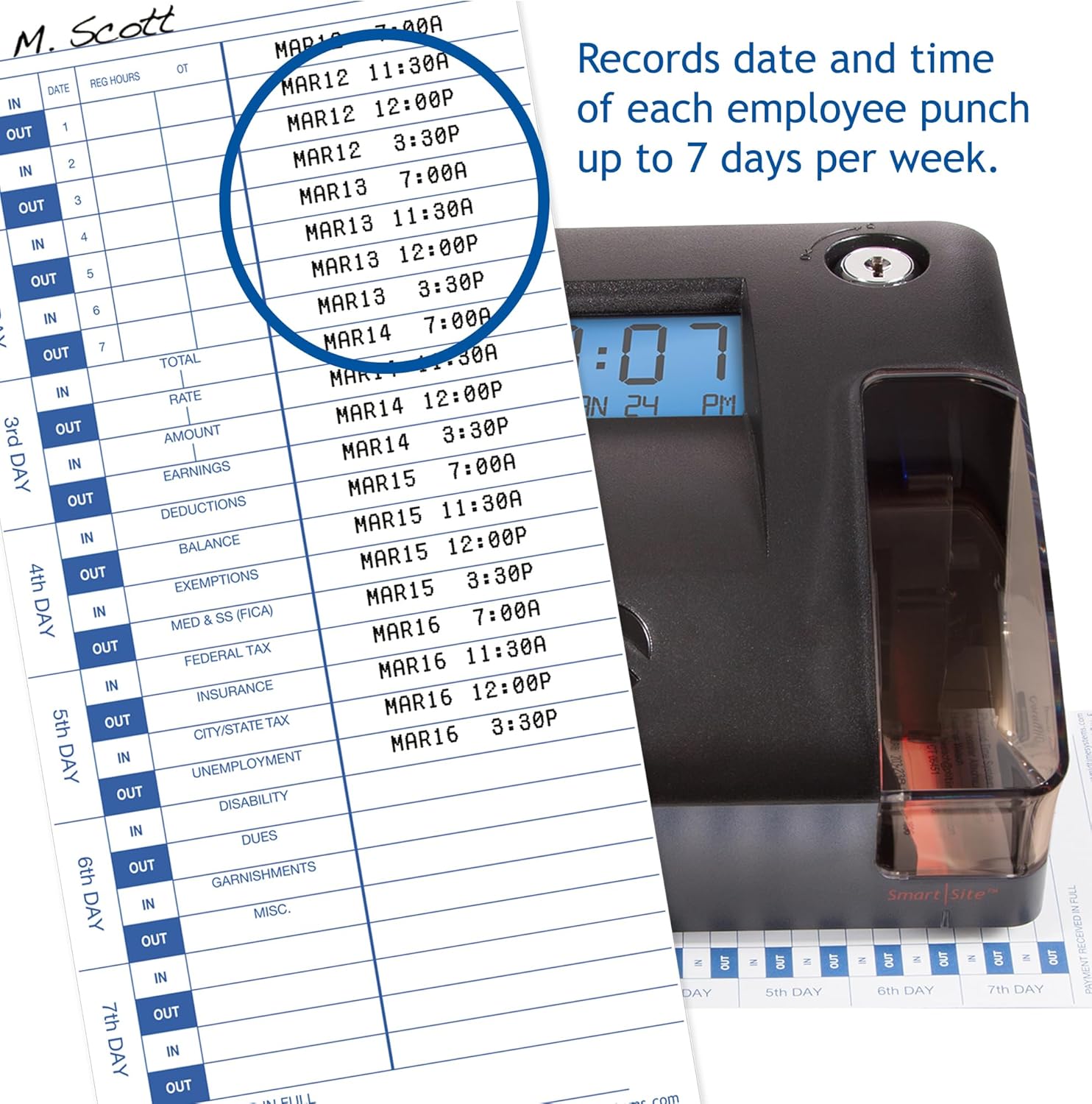 - ALL-IN-ONE BUNDLE – Includes 25 time cards, ink ribbon cartridge, 2 security keys, and a user manual. Supports 12- or 24-hour time formats with 14 built-in message options, providing a complete all-in-one solution for time clocks in small business.