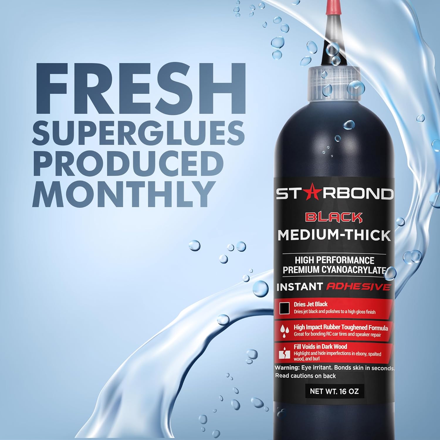 - ✅ PREMIUM CYANOACRYLATE SUPER GLUE - LAB TESTED FOR OPTIMAL PERFORMANCE: High performance industrial grade adhesive. Starbond Black Medium Thick CA is used to bond parts, with focus on impact and shock absorbance qualities.
