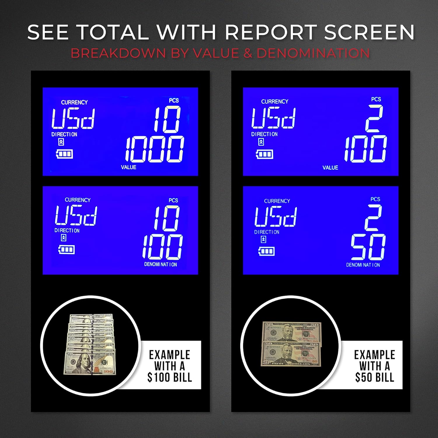 - See total breakdown of value & denomination with sophisticated report screen