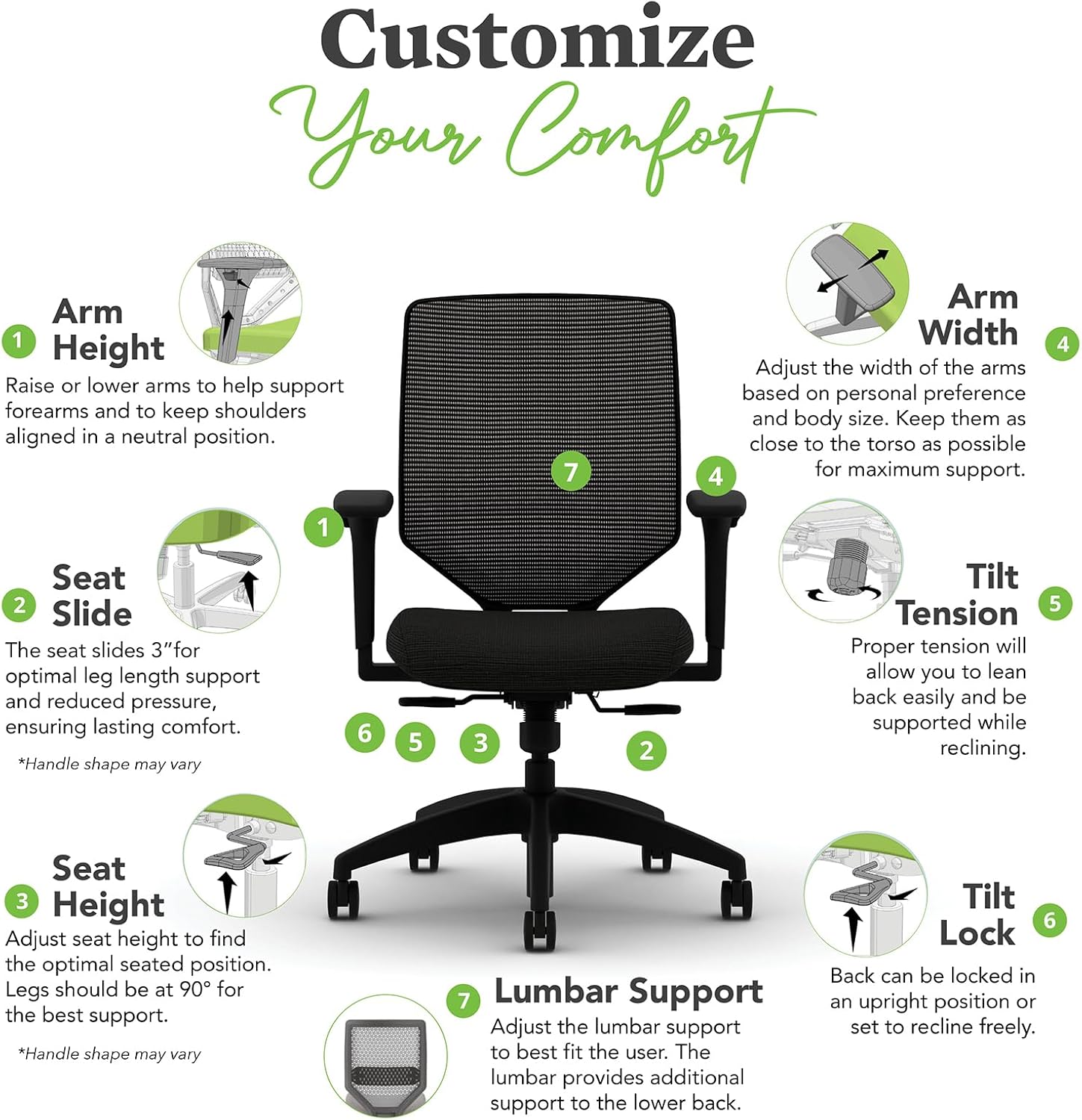 HON Solve Mesh Back Office Chair with Adjustable Arms, Adjustable Height, Tilt Tension, Lumbar Support, Swivels, on Rolling Wheels, Midnight