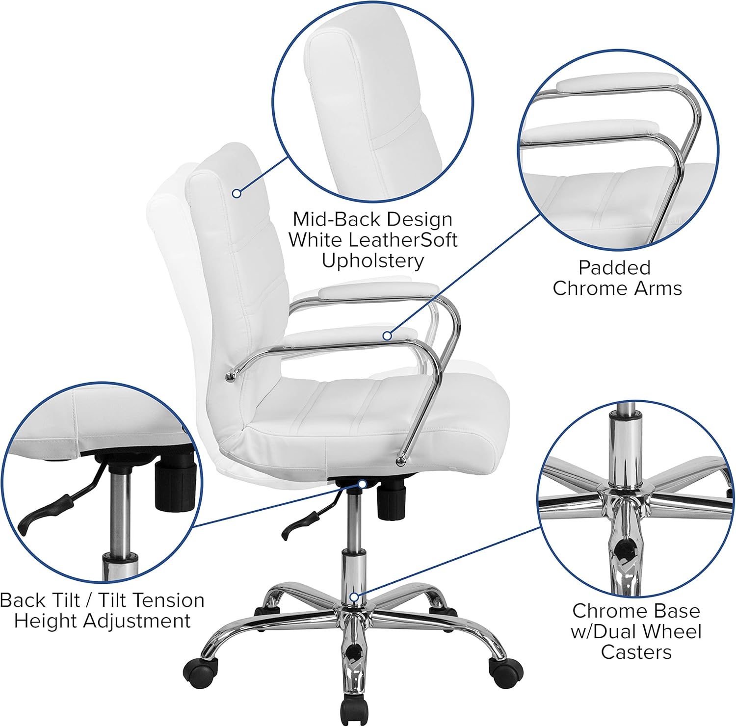 - UPGRADE YOUR WORKSPACE: Boasts a soft mid-back white LeatherSoft back and seat paired with a chrome metal base and armrests all highlighted by an attractive horizontal line stitching to boost your desk or work area with modern style