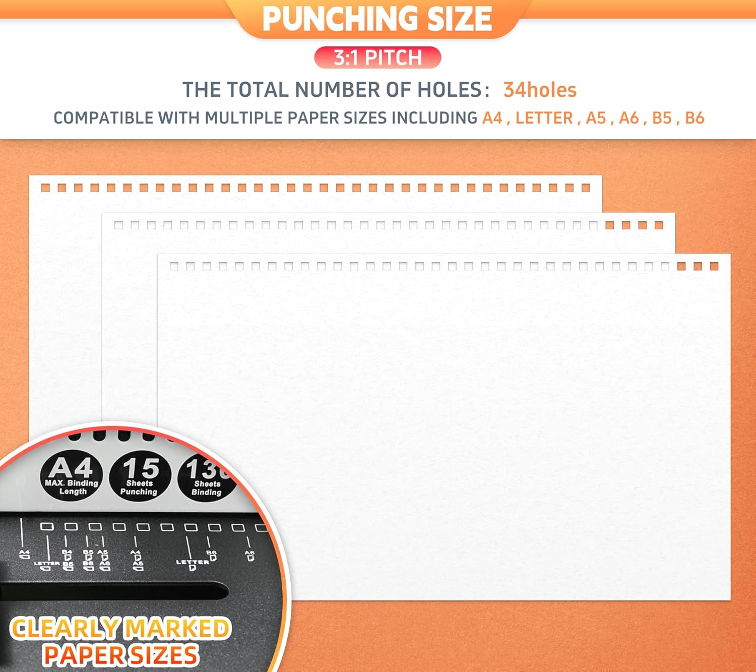 - 【Large Binding Capacity】Capable of binding up to 130 sheets of 80/20lb gsm paper with 5/8inch wire binding spines, this machine can punch through up to 15 sheets of A4 paper in one go. It also handles two sheets of plastic binding covers (0.2mm) or leathergrain binding covers (230gsm) effortlessly.