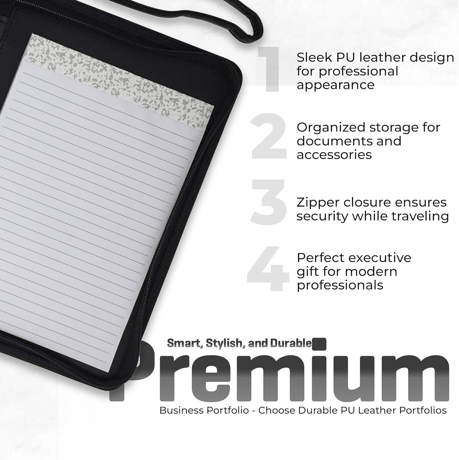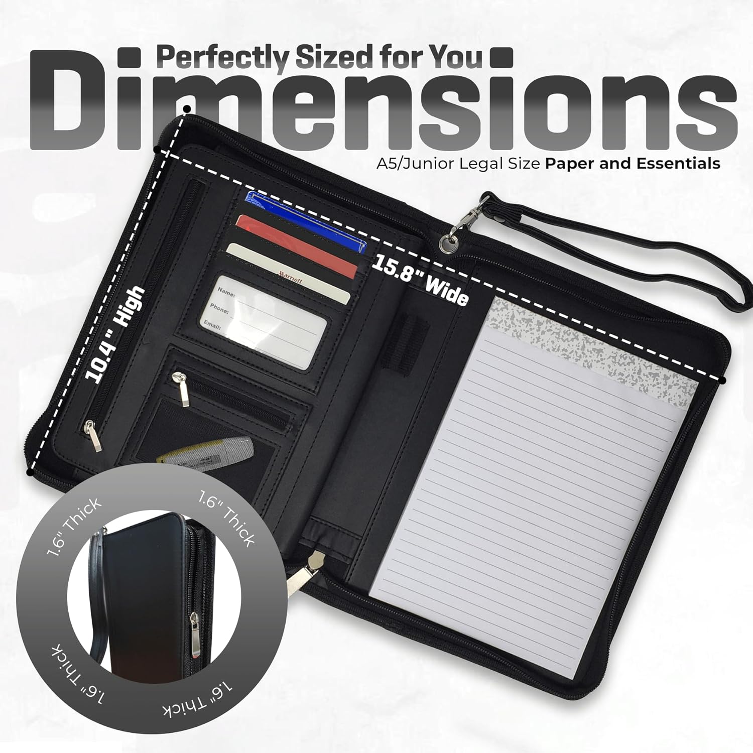 Zippered Leather Portfolio Binder with Junior Legal 5x8 Notepad - Black PU Leather Business Padfolio Organizer Folder with 8 Inch Tablet Sleeve & Gift Box by Lautus Designs