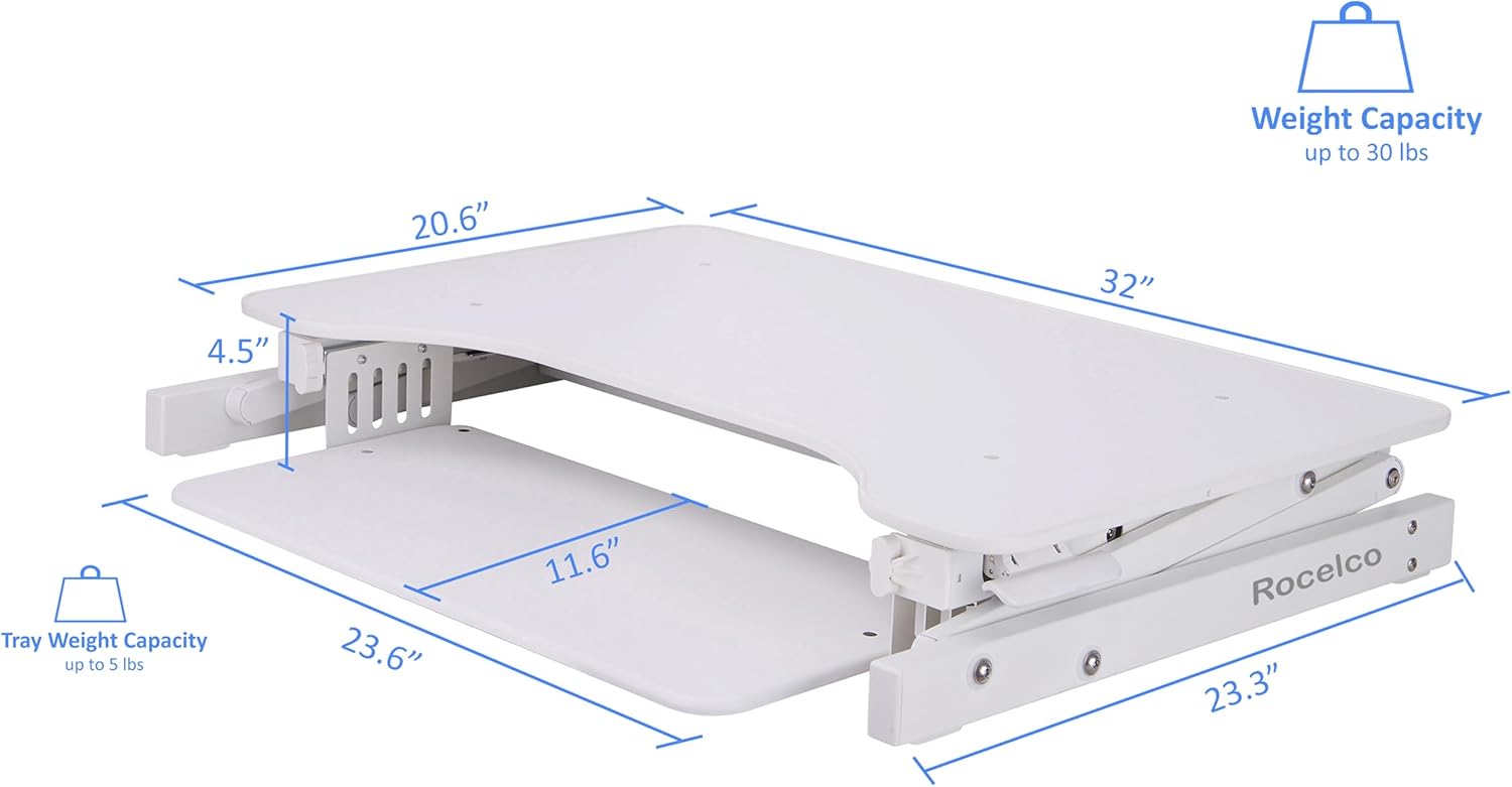 - Large stand up work surface - 32" wide by 20.6" deep desktop workstation riser holds up to two 27" monitors plus other work materials and the 23.6" by 11.6" retractable keyboard tray will hold a keyboard and mouse, or even a laptop if needed.