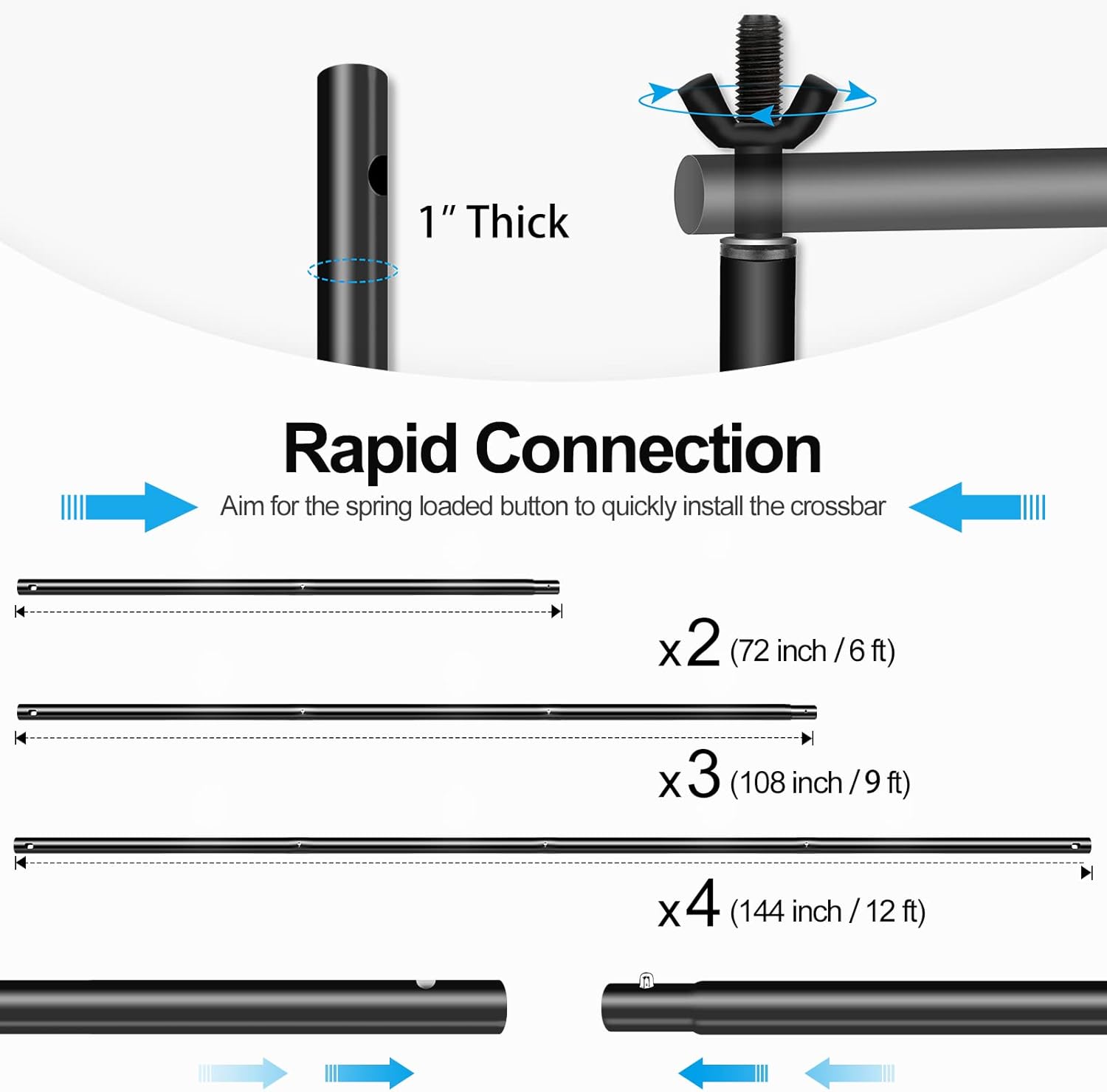 - 【Easy to Assemble】You can set up the backdrop stand in less than 5minutes without any tools.Only need to press down the bar spring clamp and insert the hole at the other end.
