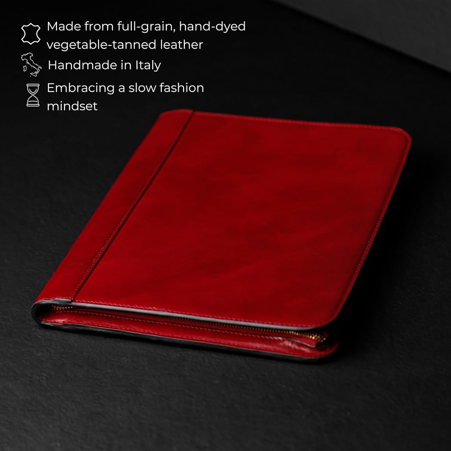 Time Resistance Leather Portfolio - A4 Document Folder - Italian Handcrafted Padfolio Organizer (Red) - Gift Box Included