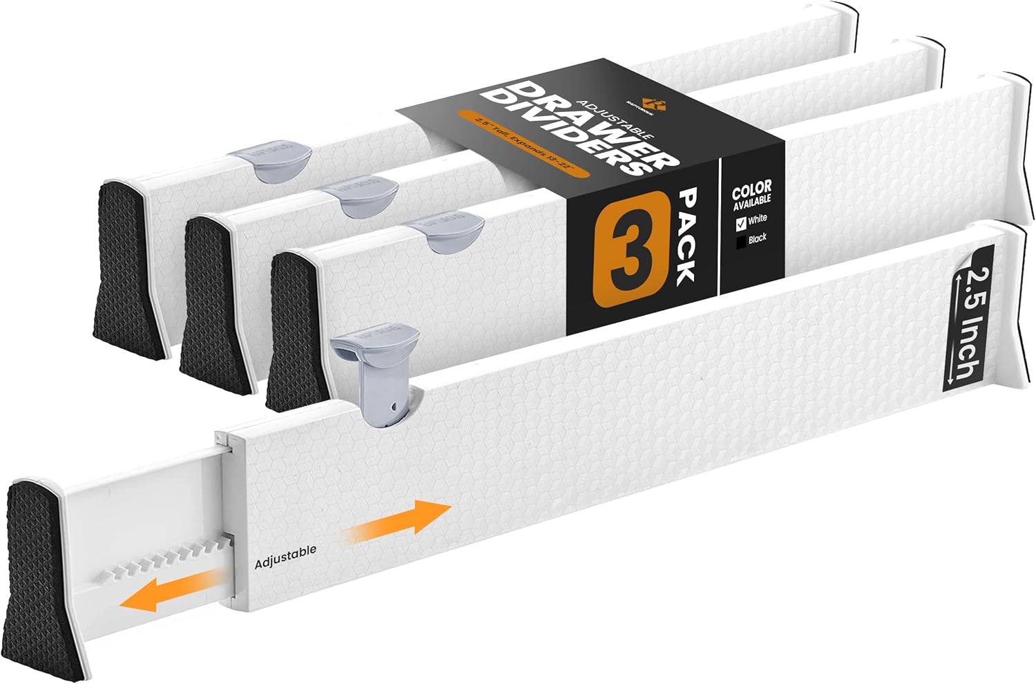 RAPTUROUS Adjustable Drawer Dividers, 2.5" Tall, Expandable 13-22", 3-Pack, Non-Slip for Dresser, Closet, Kitchen, Nursery, and Office (White)