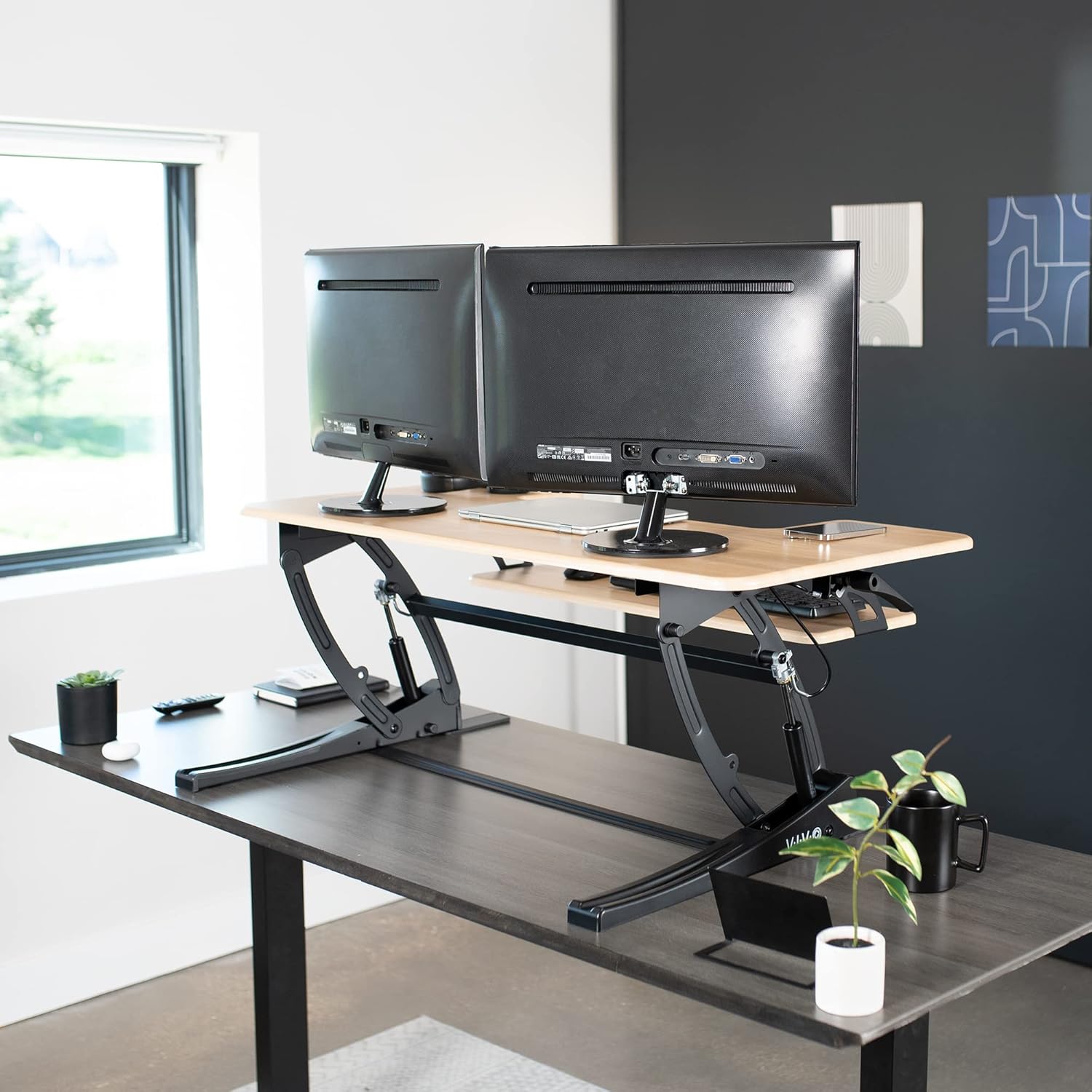 VIVO 36 inch Height Adjustable Stand Up Desk Converter, V Series, Quick Sit to Stand Tabletop Dual Monitor Riser Workstation, Light Wood Top, Black Frame, DESK-V000VO