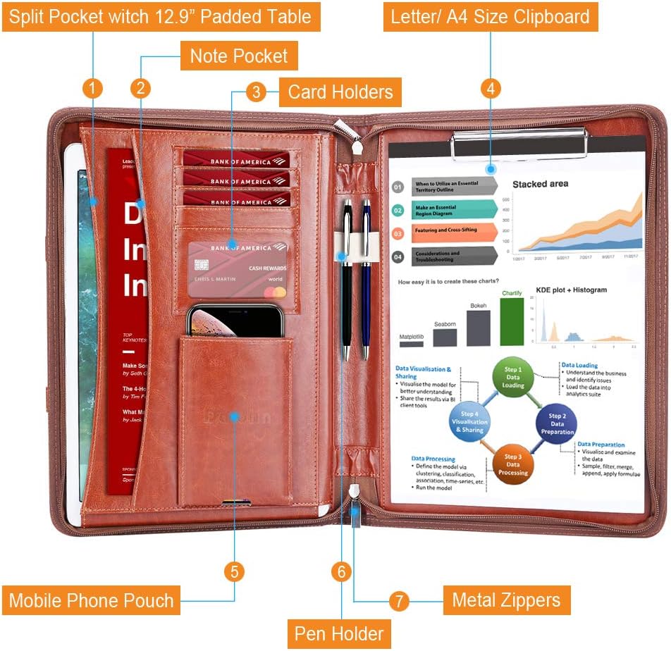 - [LARGE CAPACITY] Multiple Functions Portfolio include with a Clipboard, a Tablet Sleeve (up to 12.9-inch tablet), a Document Pocket, 5 Card Slots, a Mobile Phone Pouch with Charger Hole, and a Pencil Holder. Neat and Practical Organized All Your Stuff. This super business binder padfolio is big enough to safely store what you need yet is compact, stylish & travel-friendly.