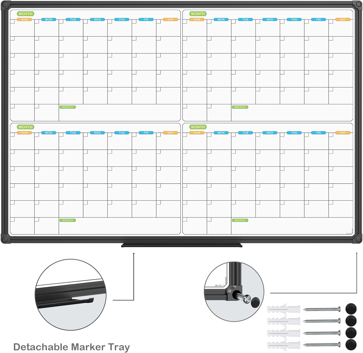 JILoffice Magnetic Dry Erase Calendar Whiteboard, 4 Month White Board Planner 36 X 24 Inch, Black Aluminum Frame Wall Mounted Board for Office Home and School