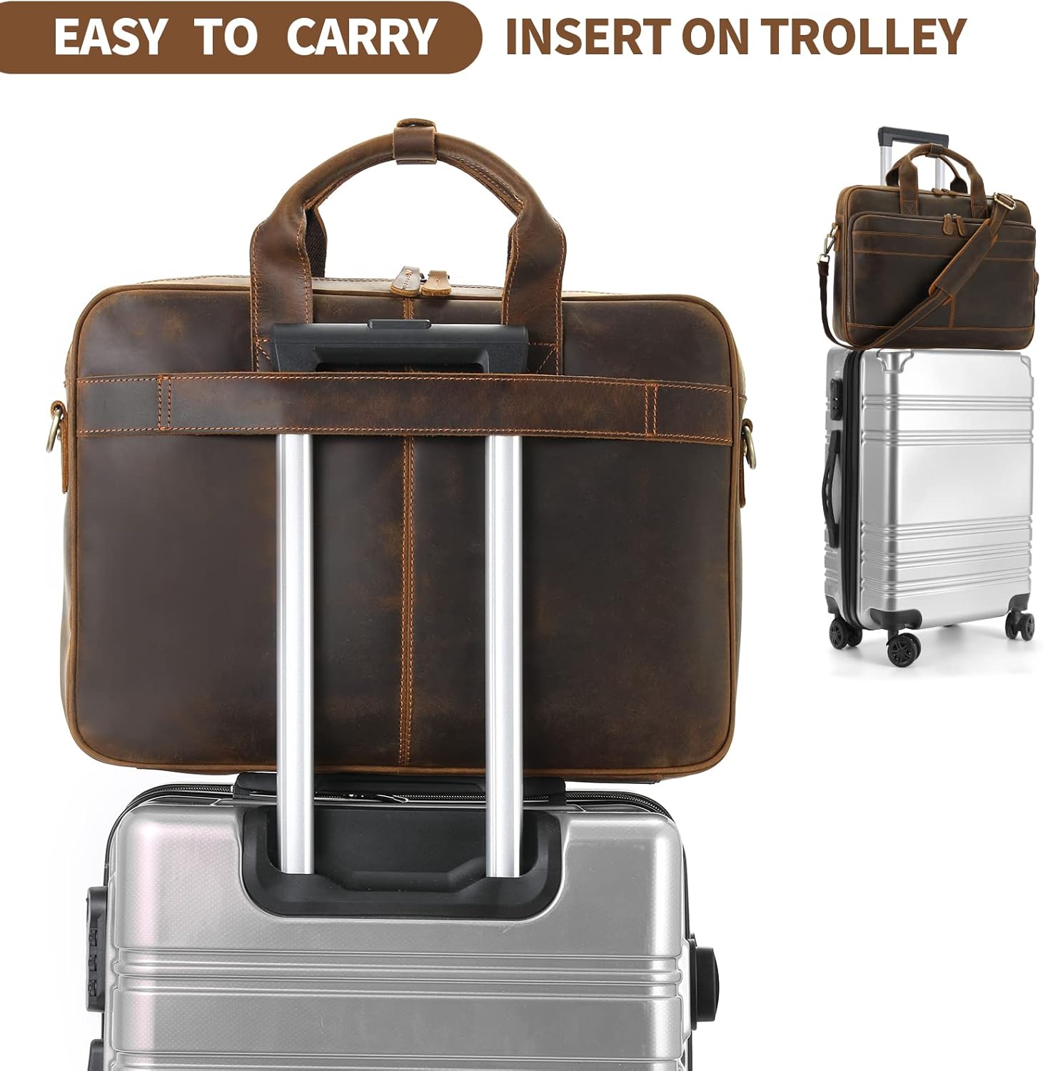 - Structure for this brown leather breifcases for mens: 1* main pocket, 1* front zippee handle of your pocket (a multi-functional storage area for A4 papers, pens, cards, key, phone, ect.), 1* inner zipper pocket, 1* 15.6 inch padded laptop compartment. There comes with leather belt on the back of this messenger bag for men that you can put it into luggage case to save your hands.