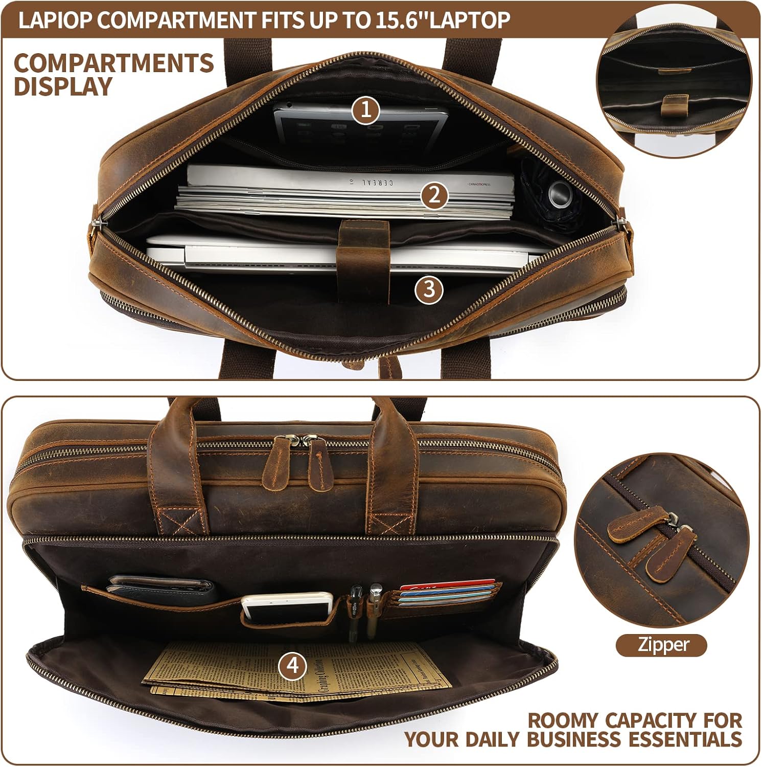 - Anti-dirty leather briefcase, light weight, This leather laptop bag can holds A4 documents, 15.6 inch laptop, books,conference files,checkbook, pens,wallet,phone and other essentials etc. Well proportioned design leather computer bag for business workplace,business trip, and daily work men bag.