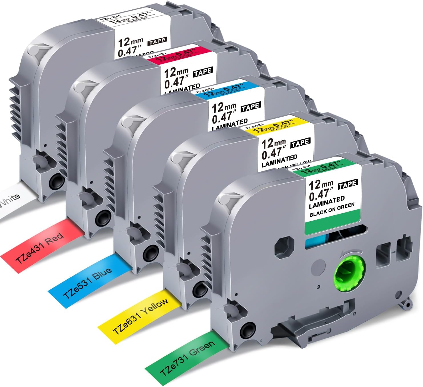 5-Pack Label Maker Tape Replace for Brother TZe TZ Tape 12mm 0.47 Laminated White Red Blue Yellow Green TZe231 431 531 631 731 Work for Brother P Touch Label Maker PTH110 PTD220 PTD210