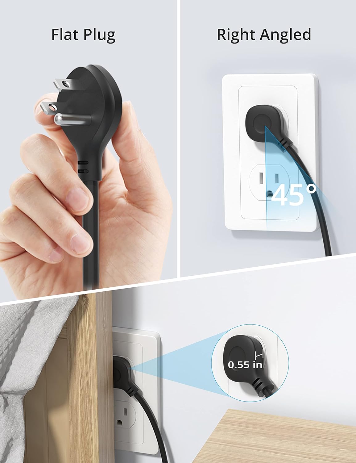 - 10ft Extension Cord Flat Plug: This surge protector power strip is made of 14AWG pure copper, and the 10-foot extension cord is heavy-duty and has a better current carrying capacity (15A). Angled flat plug eliminates awkward cords from cluttering indoor décor, and doesn’t block the bottom receptacle