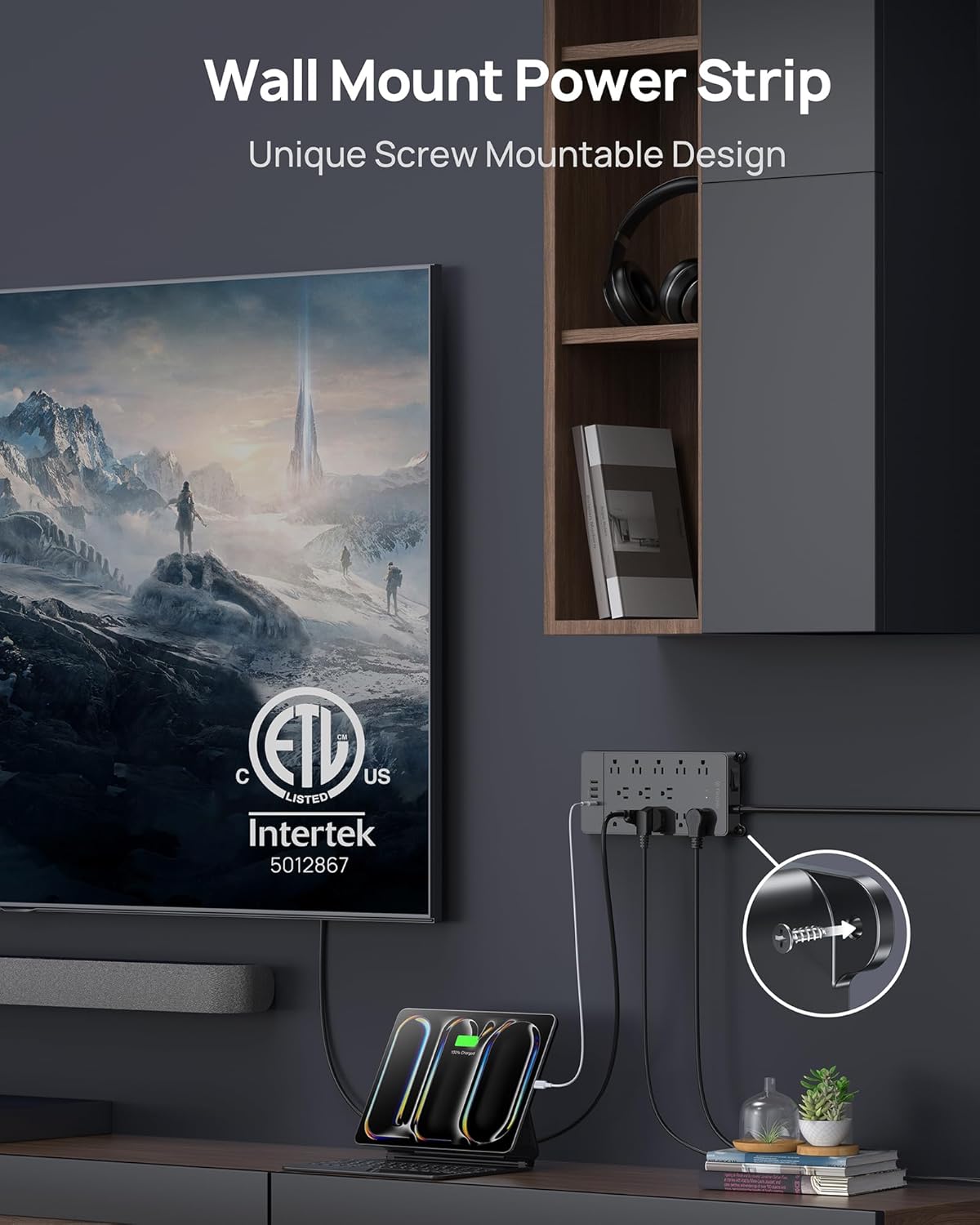- Wall mountable design - 4 screw-mounting tabs allow you to securely install this surge protector power strip in various applications, including the entertainment center, behind the TV, dorm room, guest room, garage, desktop, under desk/counters, workbenches, etc