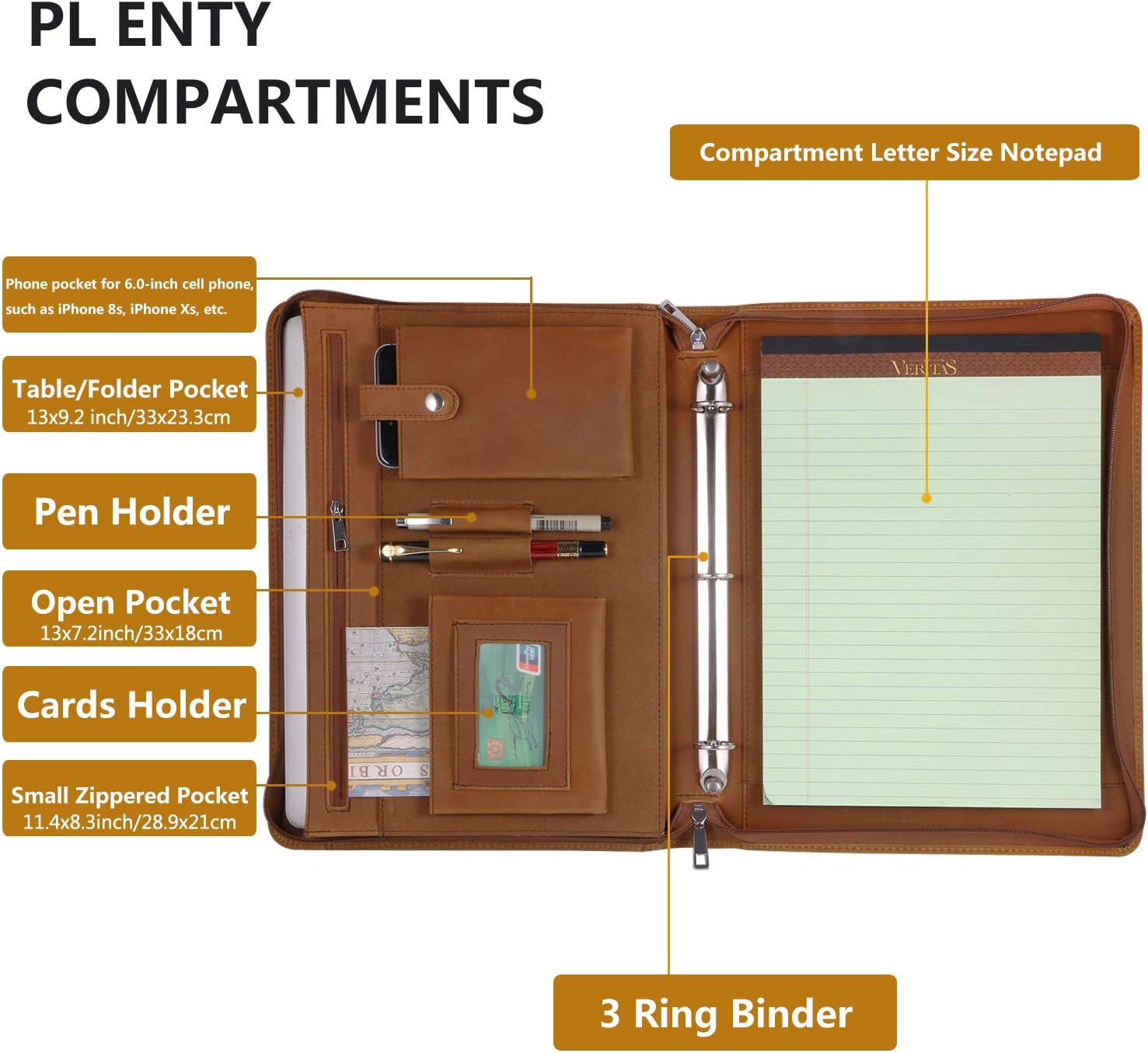 - GENEROUS PAPERWORK STORAGE–This leather padfolio for men designed for the standard US letter-sized 11”x 8 1/2” sheets, The 1-inch 3 ring binder could hold almost 80 sheets of Letter size Loose-Leaf Refills.