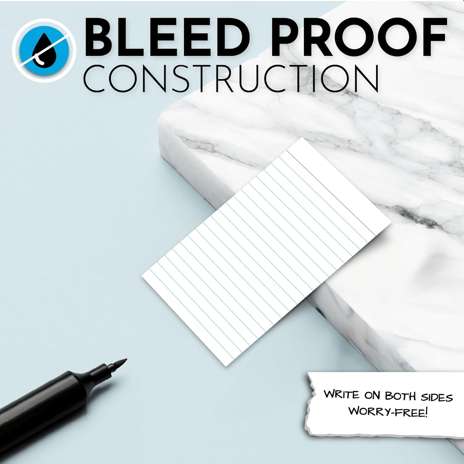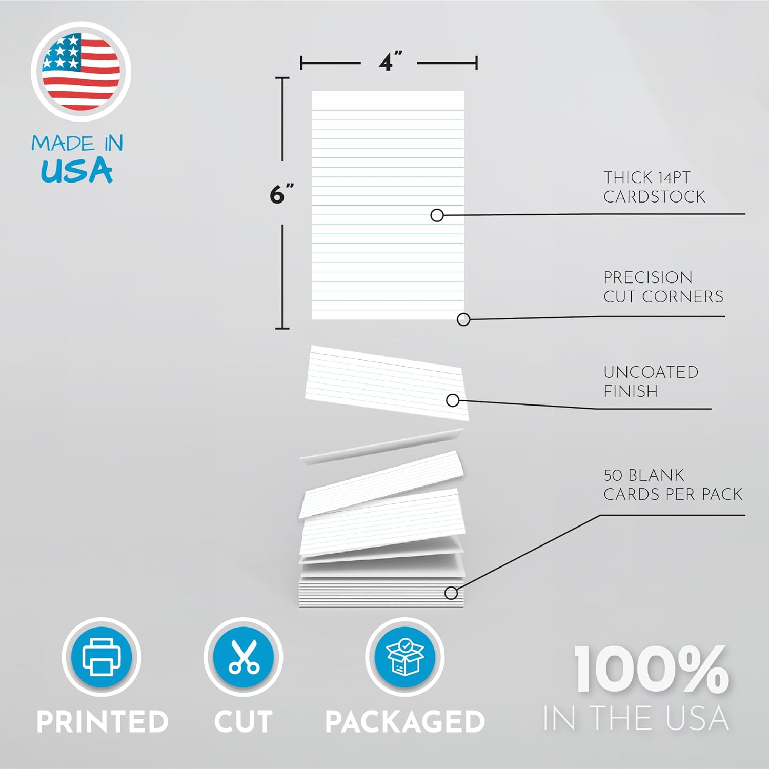 - DETAILS: (50 pack) 4” x 6” double sided, blue lined note cards with header portion at top of card. Lines printed on thick 14PT heavy duty un-coated white card stock paper for writability.