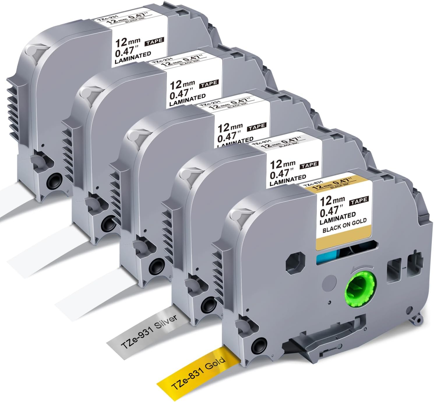 - Package Includes: 5-Pack Replacement for Brother P Touch label maker tape refill; Mode & Color: 3x TZe-231 (Black on White), 1x TZe-831 (Black on Gold), 1x TZe-931 (Black on Silver)