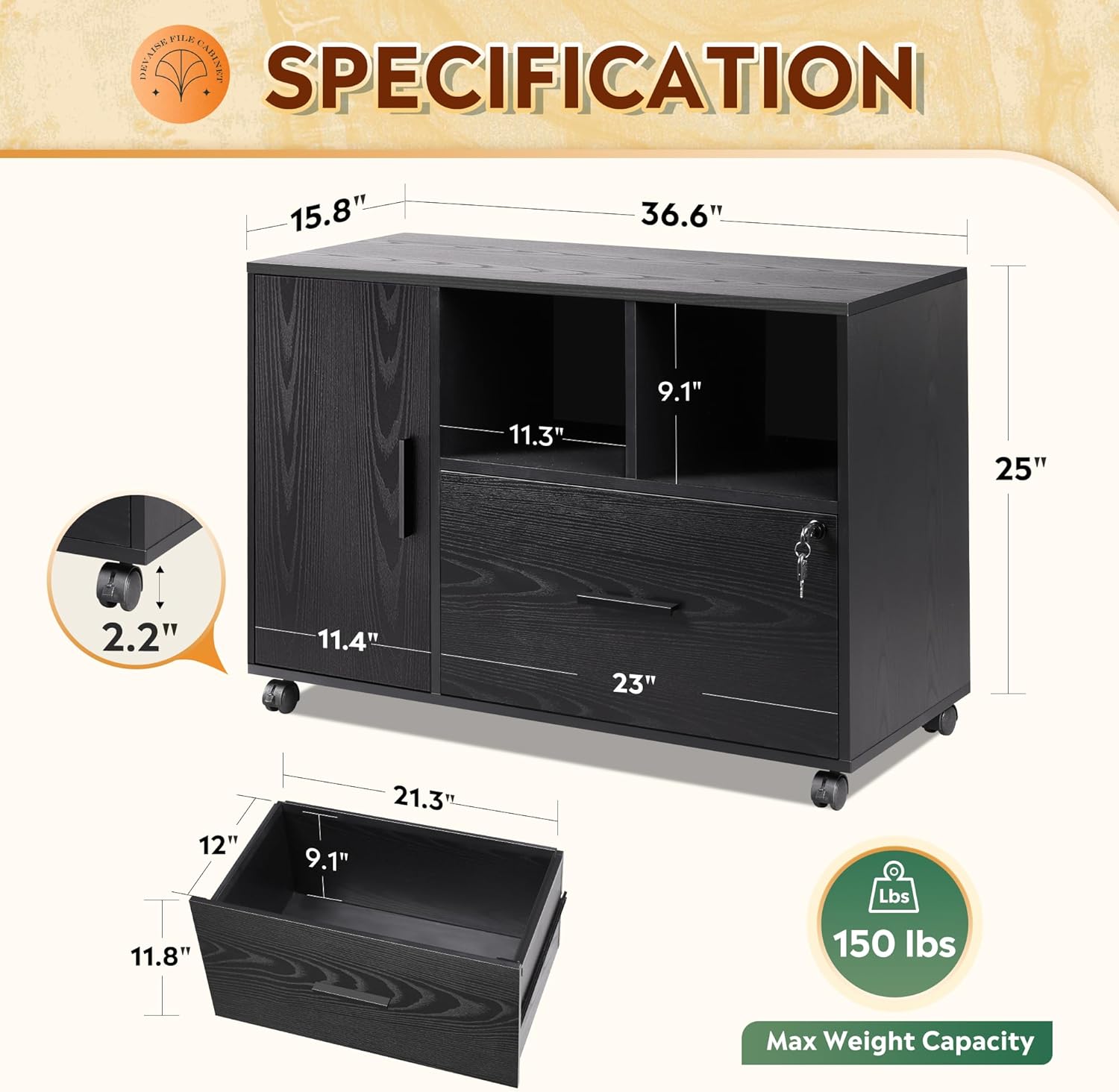 - DURABLE & STABLE STRUCTURE: Made of top-grade board for long-term use, the office file cabinet is scratch-resistant and water-resistant, and can support weights up to 150lbs. Rolling on 5 wheels (including 2 lockable casters), this wood filing cabinet can keep stable with the braking function or move freely according to your need.