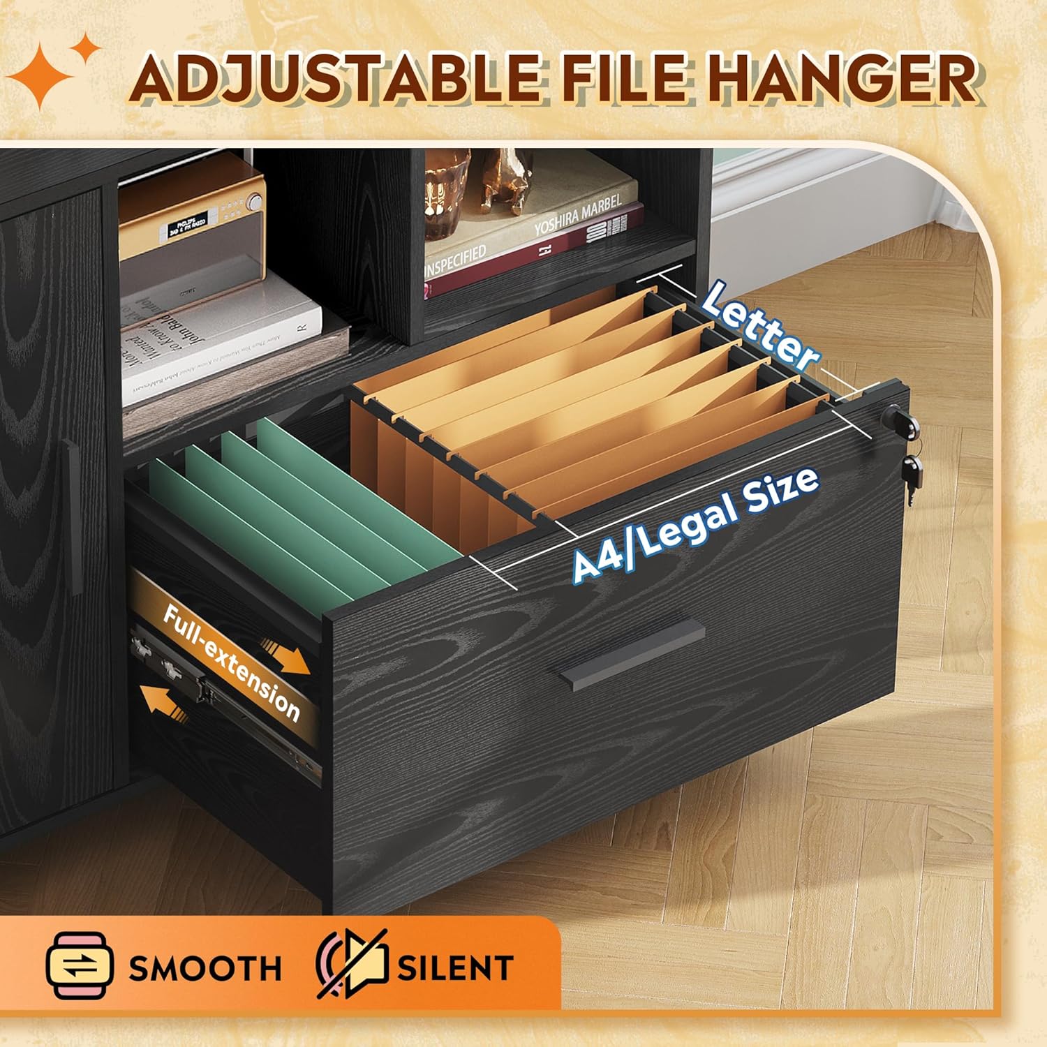 - FULL EXTENSION DRAWER: The full-extension file drawer accommodates legal/letter/A4 size files, and ensures easy access to all files even deep inside with the smooth ball bearing slides. The lock with 2 backup keys of this lateral file cabinet adds more security to important files, keeping your business private.