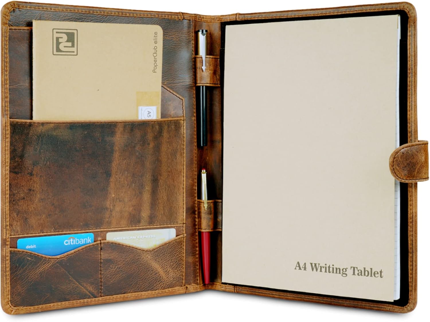 - SMART STORAGE SPACE - Compact design ensures plenty of storage space for all your work needs. Store your Letter-Size or A4 refillable notepad in the right side, with one main opening for filing sheets, one medium pouch for smaller documents, and 2 v-shaped pockets for business cards on the left side. Additionally, there are 2 leather pen holder loops.