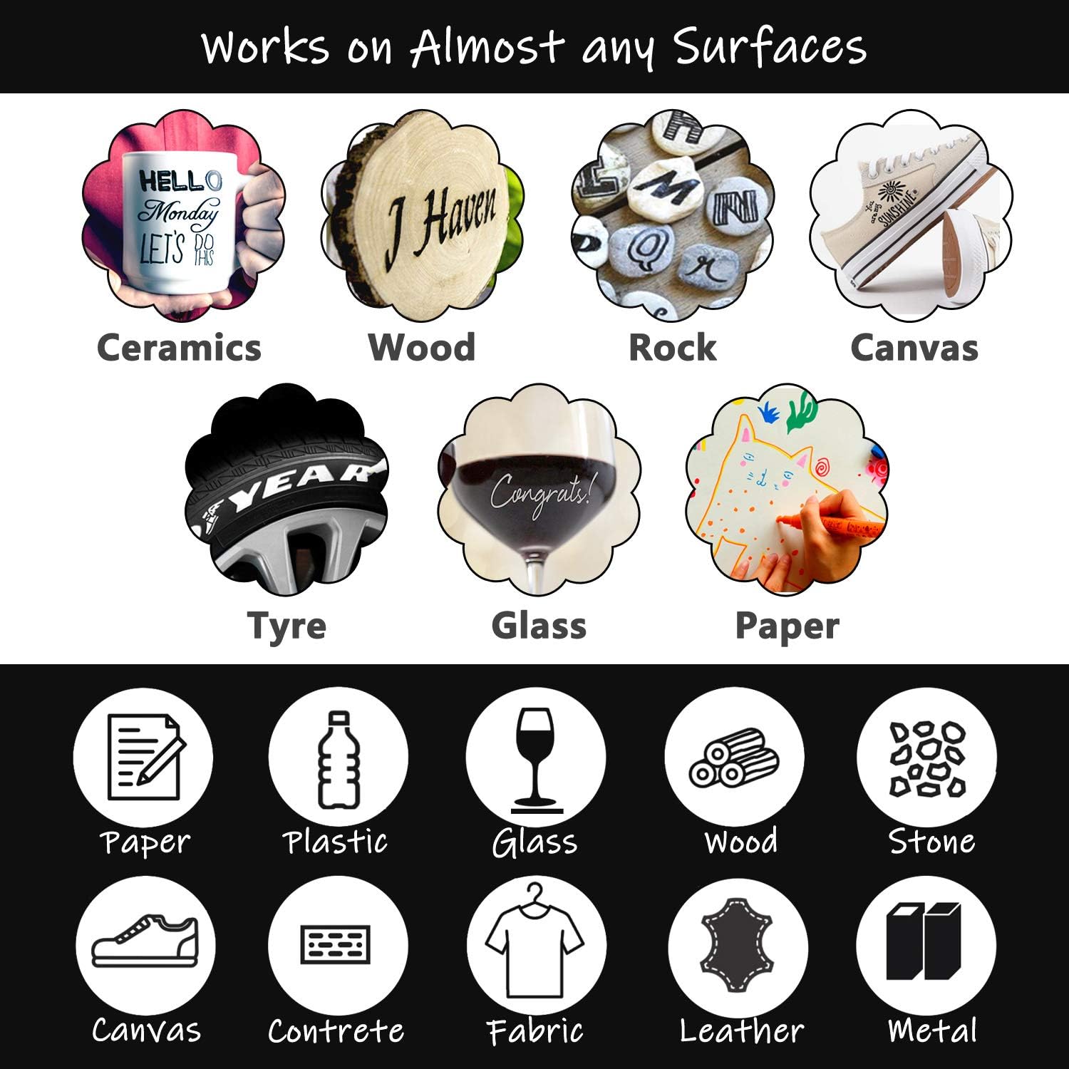 - WORKS ON ALMOST ANY SURFACES: The yellow paint markers works on almost any surfaces such as rock, canvas, wood, metal, glass, ceramic, plastic, tire, etc. They are the best tool for creativities