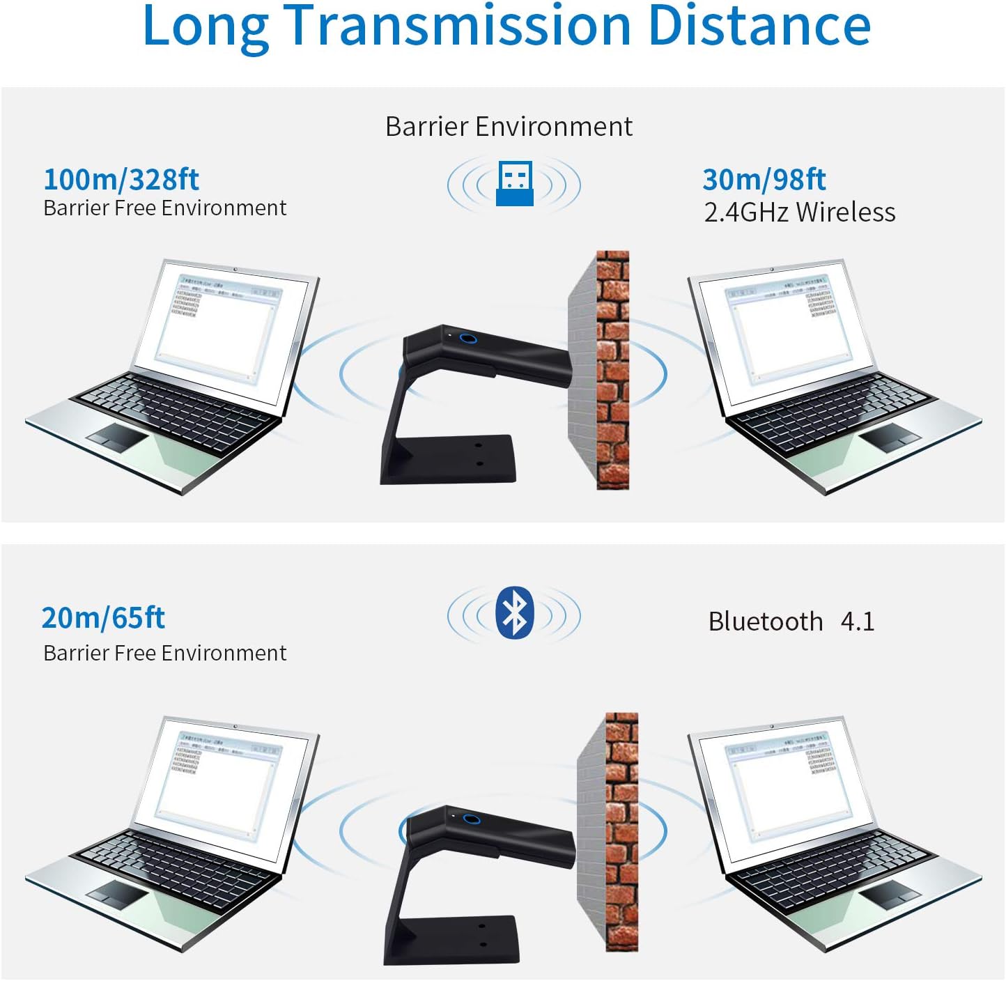 - Bluetooth Wireless 2-in-1 transmission technology can be used: it can provide a distance of up to 400 meters/0.25 miles in open areas and up to 100 meters/328 feet indoors. Without a data cable, you can freely transfer barcodes to computers, PCs, etc.