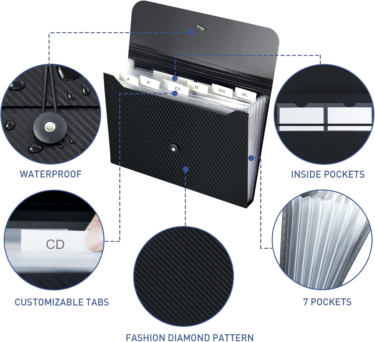 7 Pocket Expanding File Folder with Tab Inserts, Accordian File Organizer Document Receipt Organizer, Accordion Folder File Keeper A4 Letter Size, for School Home Office, Black