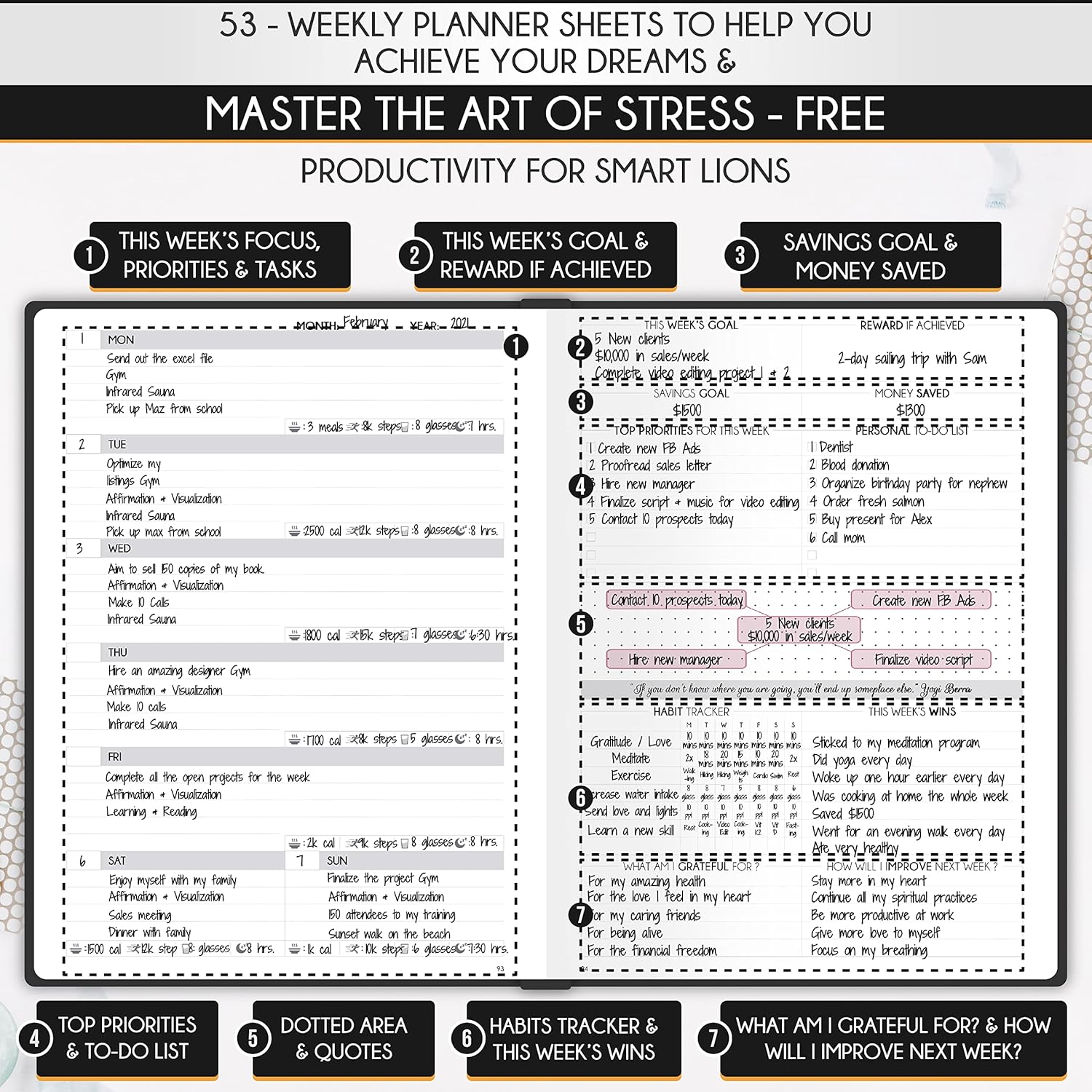 - LIFE PLANNER - A5 Size, 212 pages of life transformation, 53 weekly, 12 monthly planning overviews & reflection, 22 dotted journal pages, habit trackers, mind maps, morning & evening routines, inner pockets, pen holder & gift box