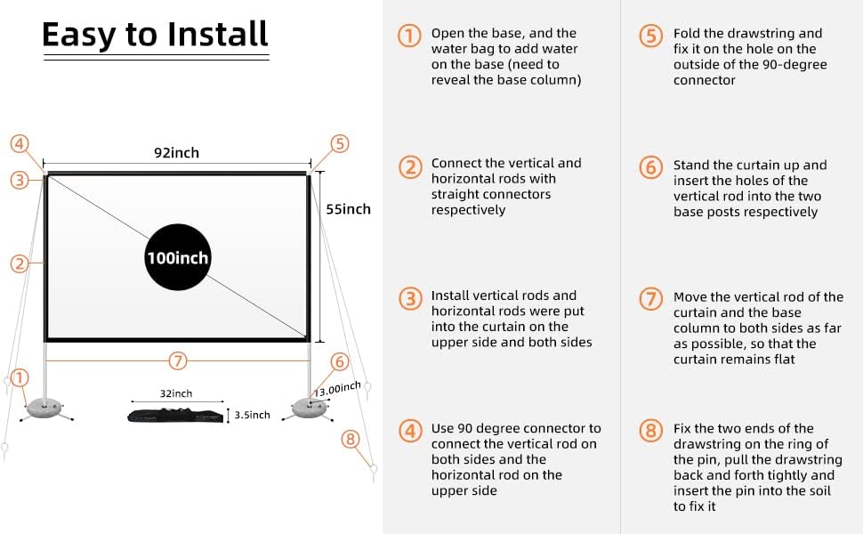 - 🎥【EASY INSTALLATION】The projection screen can be assembled in 5 minutes without any complicated tools. No screws, just a few accessories for quick and secure setup, and easy assembly and disassembly.
