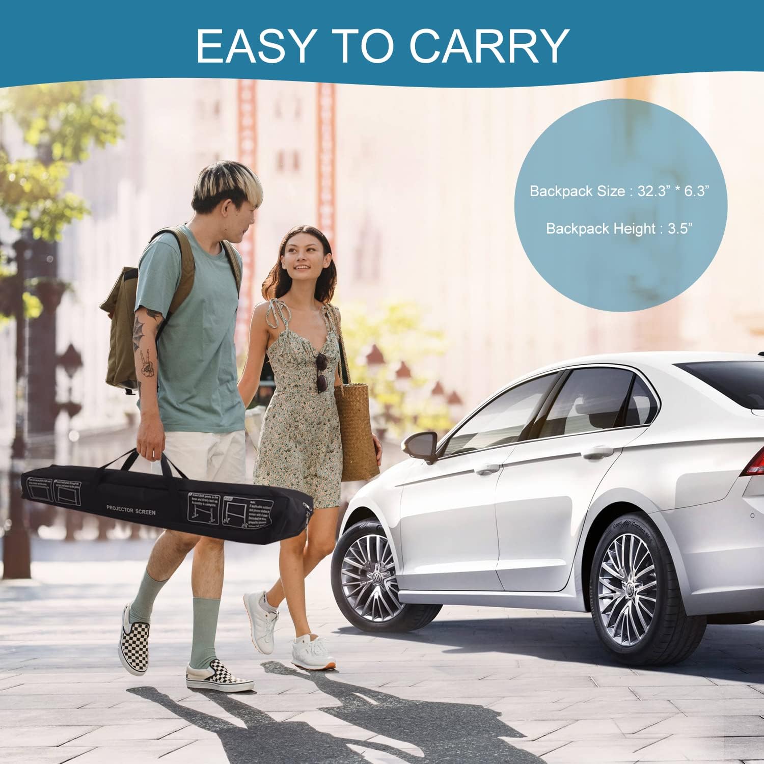 - 🎥【EASY TO CARRY】The projection screen with stand weighs only 8 lbs. The Matching storage bagmakes your camping experience even better, you can hold it in one hand, it is convenient to carry and set up anywhere you want, and you can travel with it in the trunk of your car. This makes trips like family trips, camping or movie nights easy.
