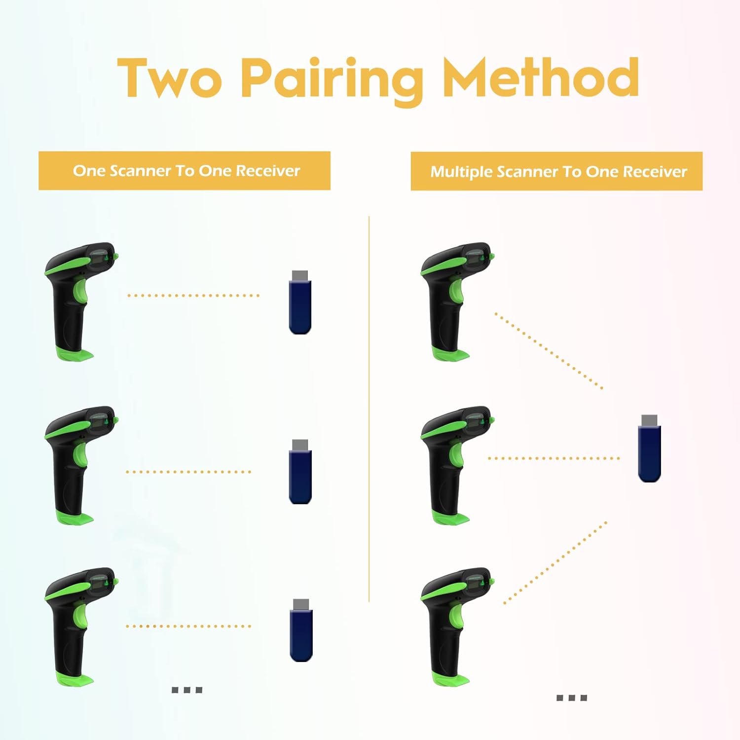 - Two paring mode: One-to-one mode, Multiple-to-one mode. At one-to-one mode,one scanner only transmit barcode to the one usb receiver. AT Multiple-to-one mode,Multiple scanners can transmit barcode to the one usb receiver - ideal in a warehouse where several people are scanning at once.