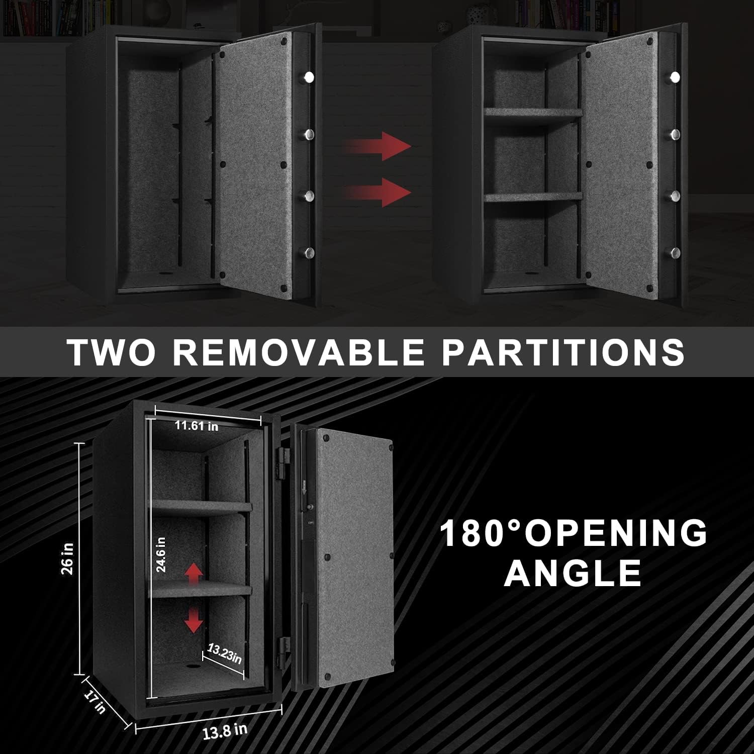 - ăLARGE CAPACITYăYou can adjust the position of the two removable dividers up and down according to your needs, which helps to maximize space of security box and keep things more organized. The 3.47 Cubic Feet capacity can easily hold a lot of cash, jewelry, passports, even legal size documents and more.