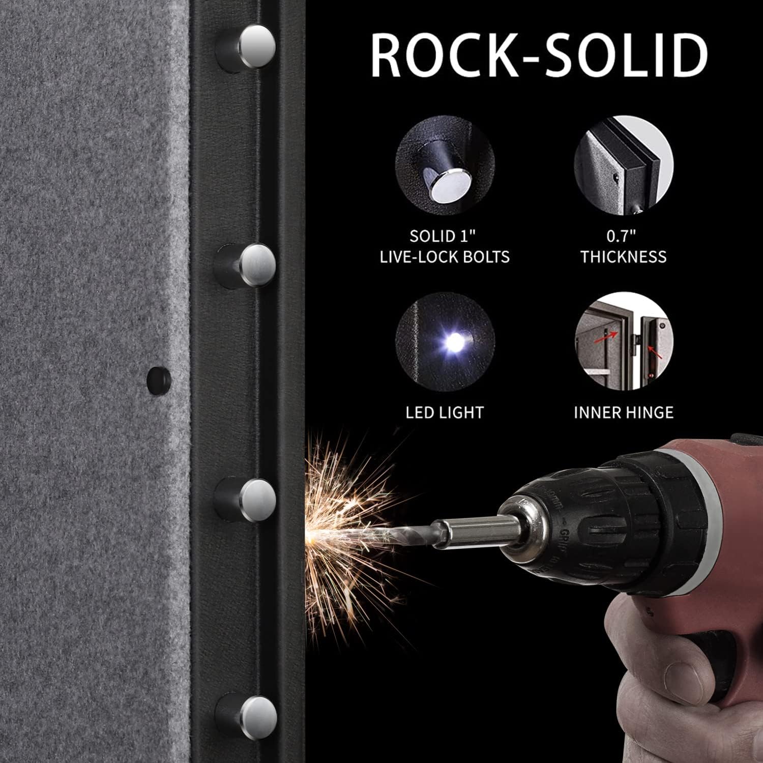 - ăROCK SOLIDăTiger King fire safe is made of thickened steel and weighs 81.9 pounds. Equipped with four solid 1 inch livelock bolts to prevent drilling and prying. When the door is closed, the inner hinge side is recessed behind the outer edge of the safe. Even if the outer hinge is cut, the inner hinge can ensure the sealing of the door, providing a strong and reliable anti-theft capability.