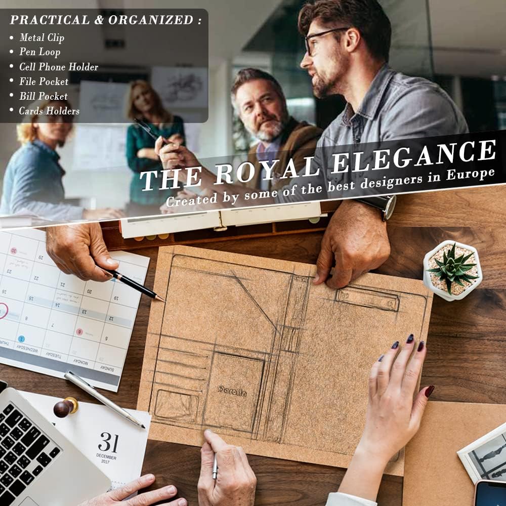 - [PRACTICAL & ORGANIZED] Darolin padfolio portfolio case designed with one metal clip, pen loop, cell phone holder, file pocket, bill pocket and 4 card holders. Various inside pockets and slots capable of holding documents, letters, notes, envelopes, mobile phone, pens, business cards and other stuffs, which facilitate your daily use and business travels, make your work or study more efficient.