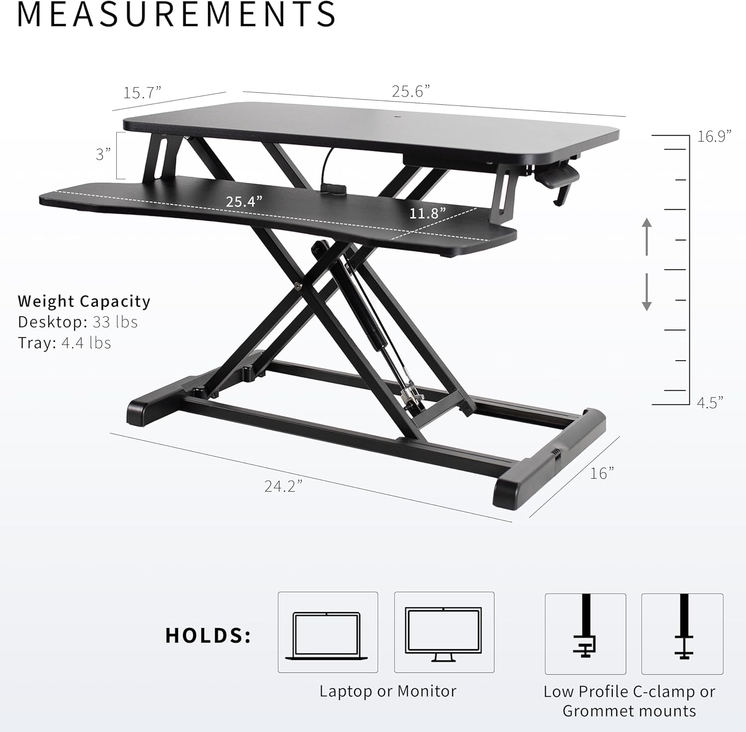 - Space Efficient 26" Surface: The top surface measures 25.6” x 15.7”, which will easily fit in your workspace. The 25.4” x 11.8” (11” in center) keyboard tray raises in sync with the top surface to create a comfortable workstation