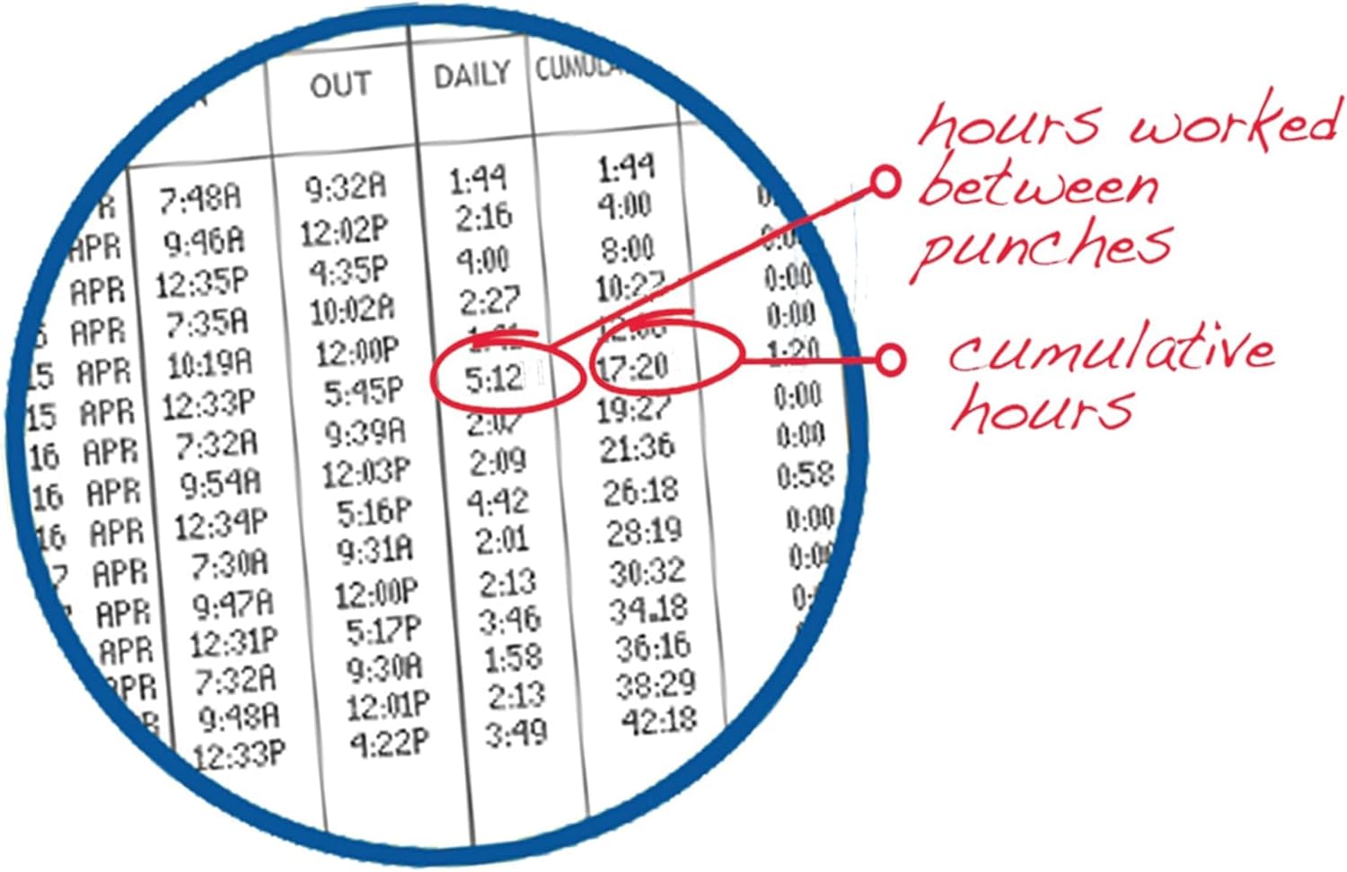 - Prints date, cumulative time and daily overtime, month, in and out punch times and total time between punches.