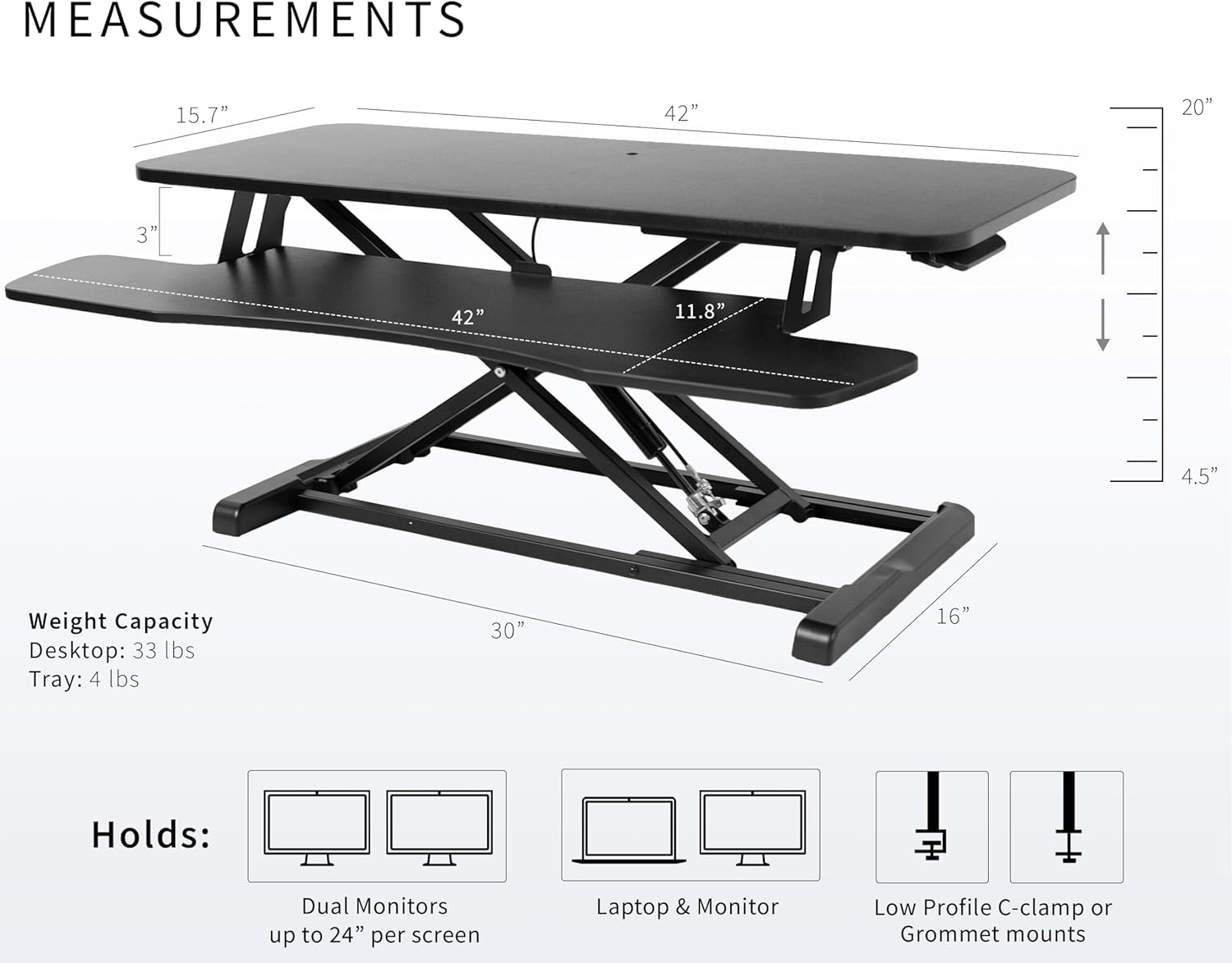 - Space Efficient 42" Surface: The top surface measures 42” x 15.7”, which provides plenty of room for dual monitors. The 42” x 11.8” (10.2” in center) keyboard tray raises in sync with the top surface to create a comfortable workstation