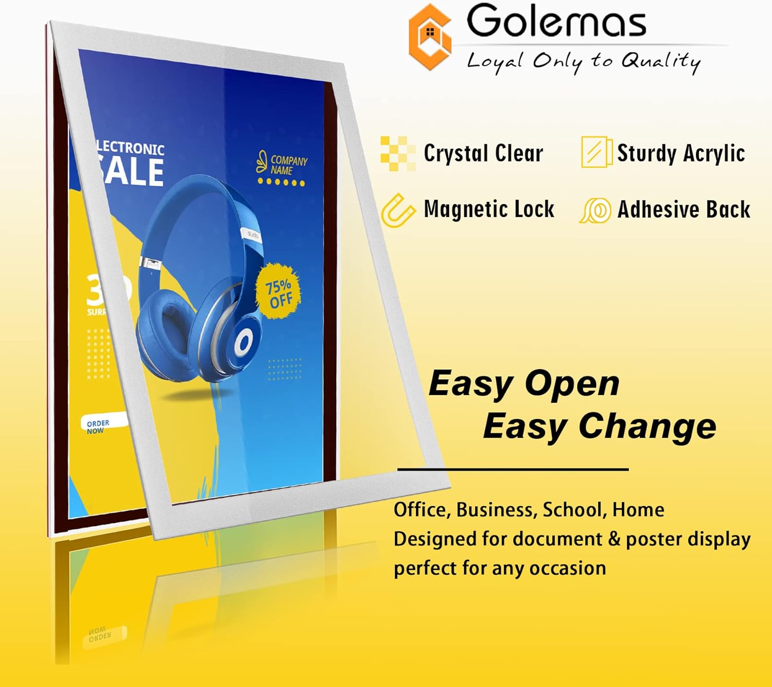 - MULTI-USE FRAME: Golemas Acrylic Magnetic Display Frame is a great tool to display signs in store, restaurant, school, office, factory, bank, hotel and so on. Meanwhile it's a great choice to use it at home to present photographs and artworks on a refrigerator or cabinet.