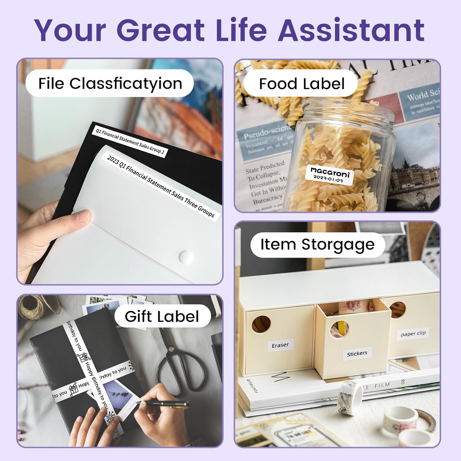 - Wide Application - The Phomemo D30 Sticker Printer is perfect for organizing home supplies (storage, food date marking, cosmetic classification, jar stickers), school supplies (name labels, study notes, office files), cable and personal item identification, and small business use (price tags, jewelry tags, and more)