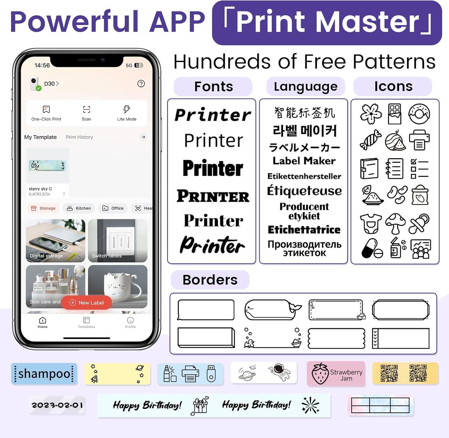 - 2025 Upgrade Version - The Phomemo D30 Bluetooth label maker supports continuous and fixed-length label tapes. It is half the weight and size of traditional label makers and is equipped with a German thermal print head. Print quality has increased by 25%, providing superior clarity, hassle-free operation, smooth printing, and fast processing