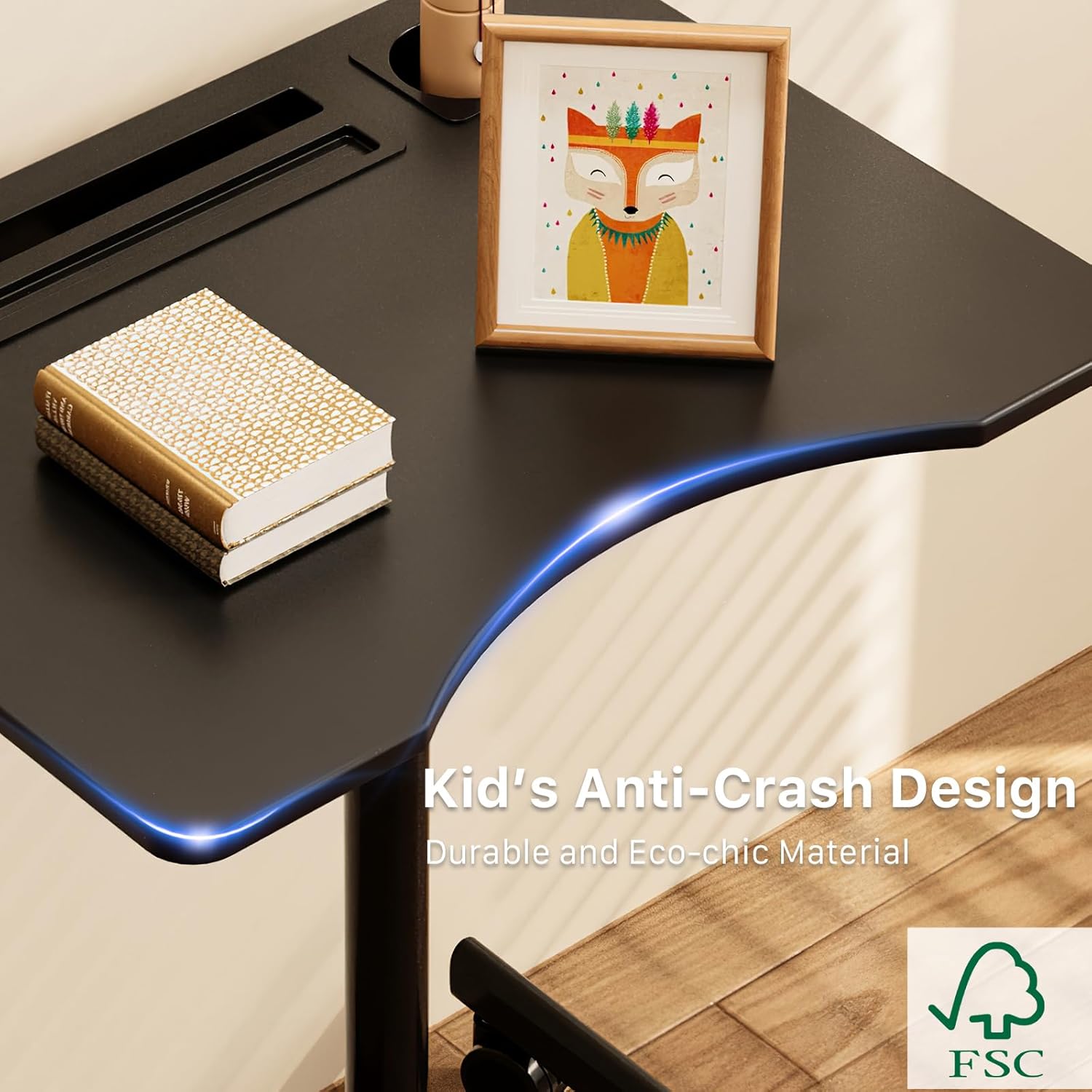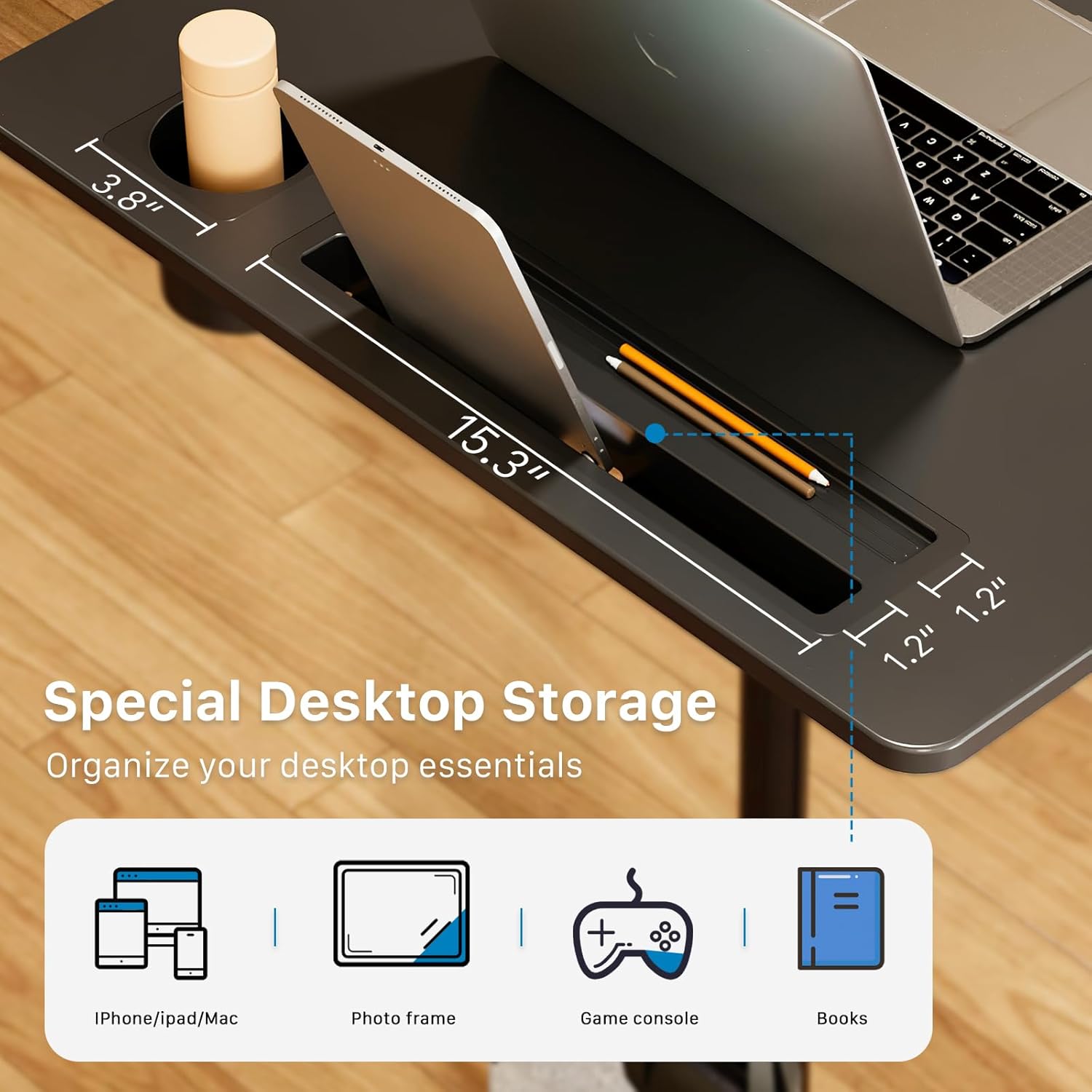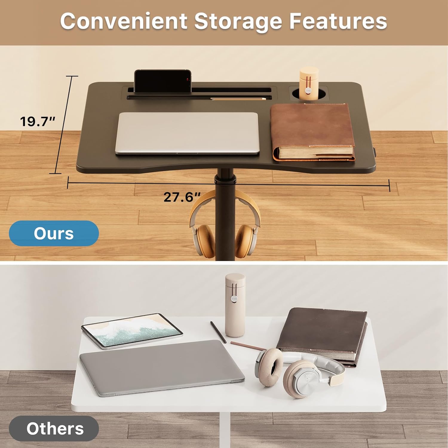 - Multipurpose Mobile Laptop Desk: The rolling desk is equipped with cup holder and dedicated slots, it's a good way to contain your drink and office supplies. Meanwhile, Hook design makes it convenient to organize your headset or backpack