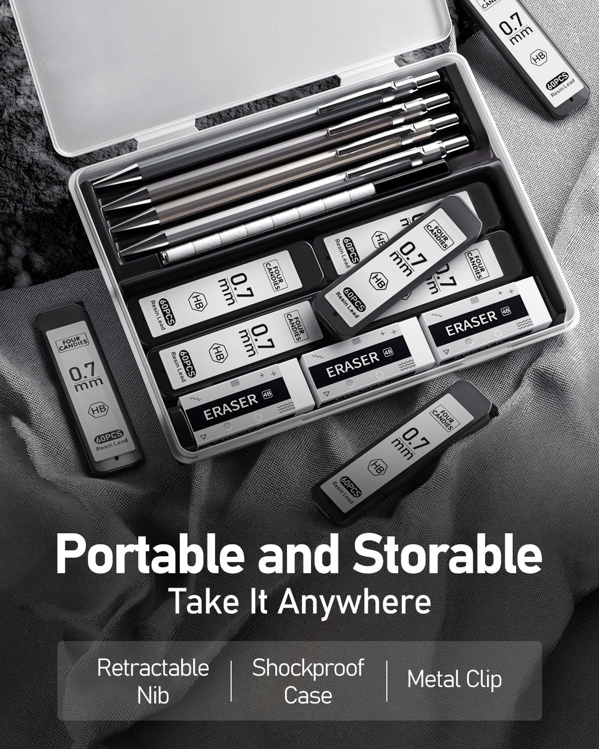 Four Candies 0.7mm Mechanical Pencil Set with Case - 4PCS Metal Mechanical Pencils, 8 Tubes HB #2 Lead Refills, 3PCS 4B Erasers and 9PCS Eraser Refills, Lead Mechanical Pencils for Writing & Drawing