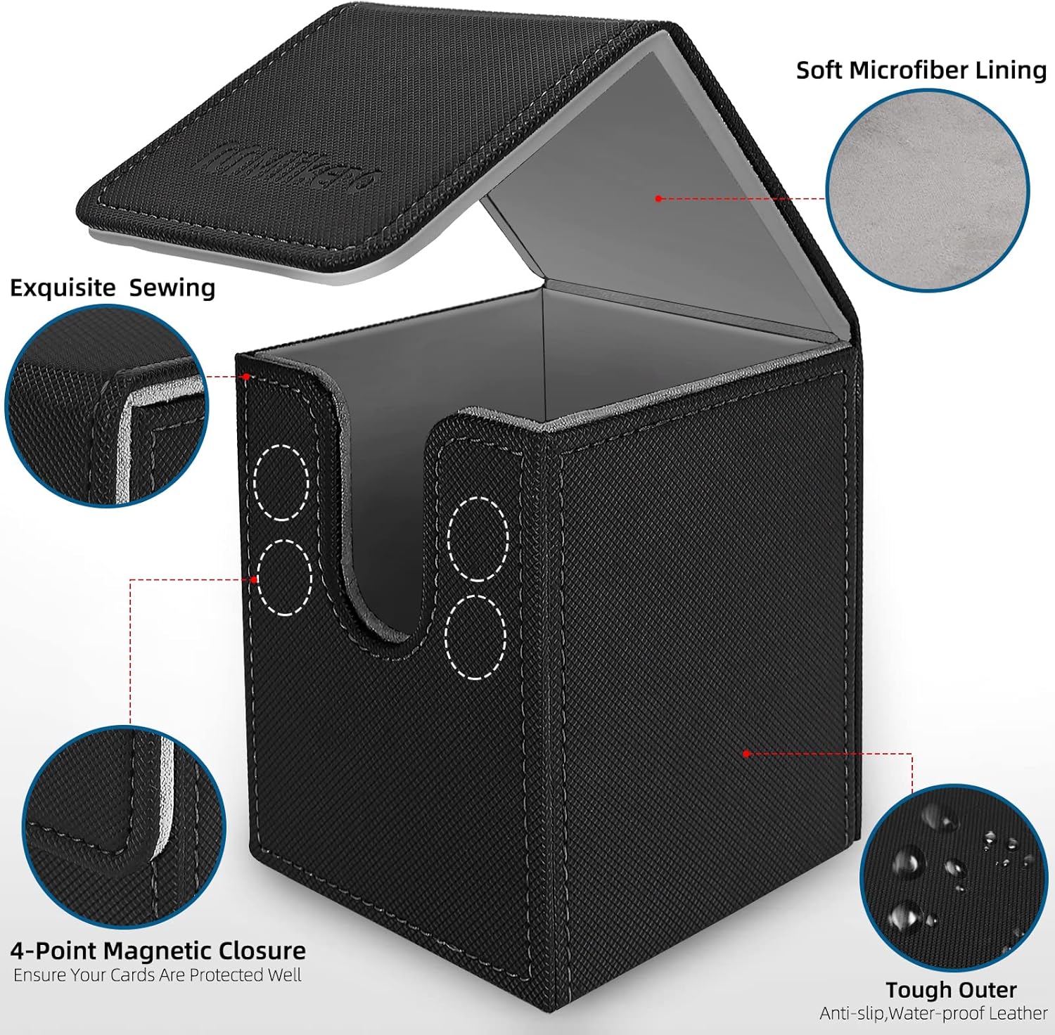 - 【Premium Quality-Sturdy and Durable】Our card deck box is made of high quality,the exterior of the deck box is waterproof material and a soft microfiber lining that protects your cards from scratches, creases, and more from the inside out.The tough outer material make the deck box feel great and look very impressive,sturdy and durable material make a perfect protection for your all kinds of cards.