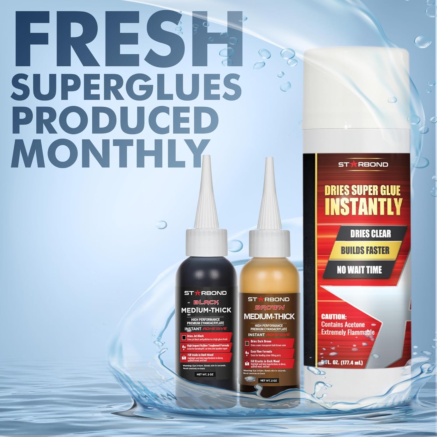 STARBOND Premium Grade Cyanoacrylate (CA) Super Glue, Black (2 oz) and Brown (2 oz) Medium-Thick Viscosity Knot Filler and Aerosol Accelerator (6 oz) Bundle for Woodworking, Woodturning, Carpentry