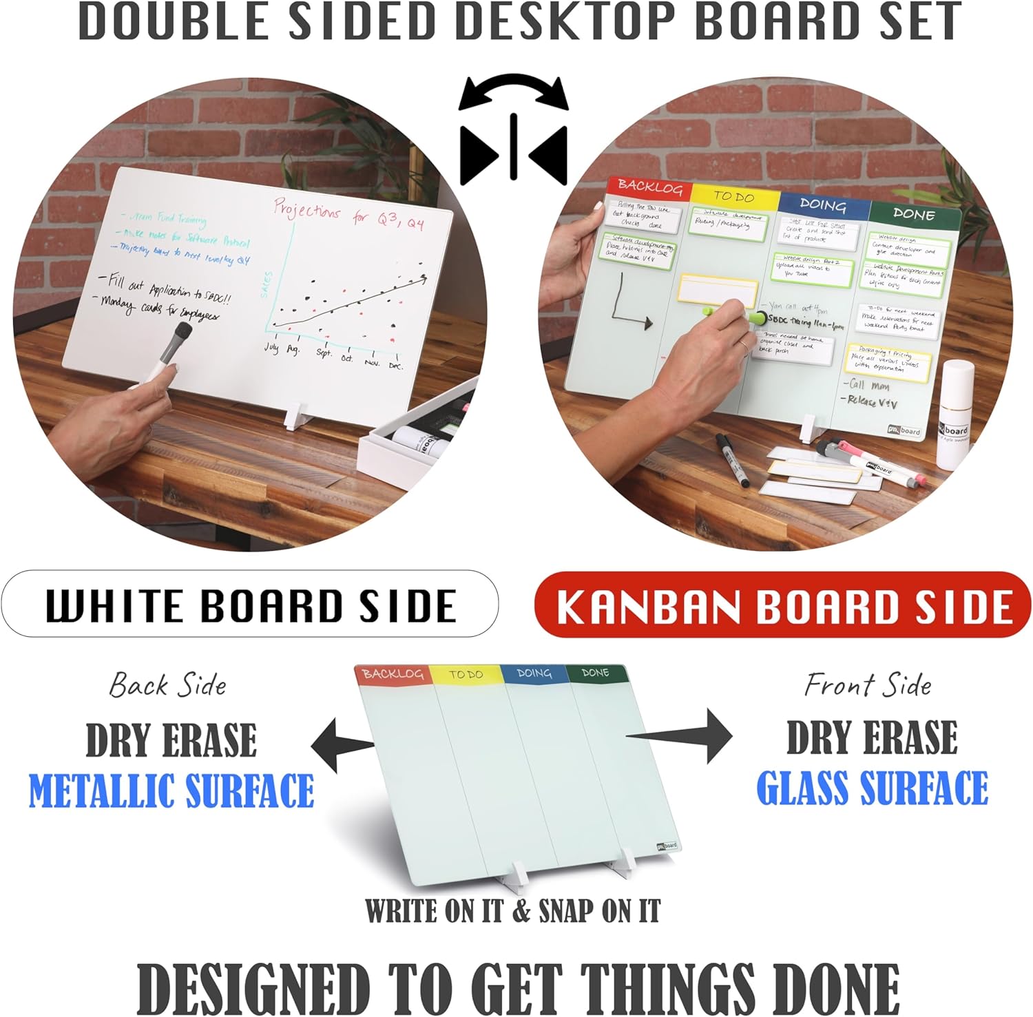 - ✔ Double Sided Desk Agile Management Board and Dry Erase Desktop Whiteboard Kit. One side of the board is a glass surface with pre-designed Kanban Board layout, the other side of the desktop board is a whiteboard. The Kanban and White Board Desk kit is designed to maximize your efficiency and get things done without leaving your desk!