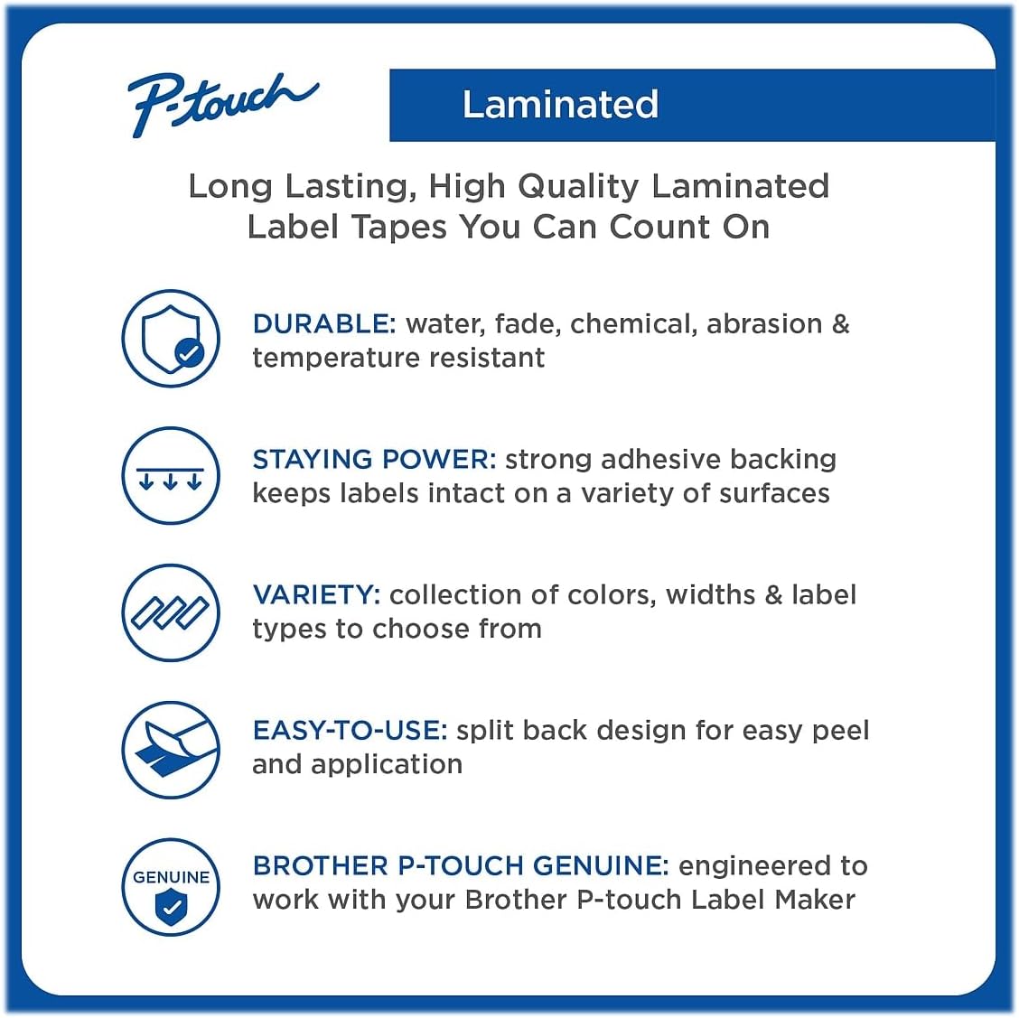 - MULTIPLE USE APPLICATIONS - Brother Genuine P-touch Laminated Label Tapes are perfect for home and industrial use. These labels are great for shelving, kitchen use, cabinets, and more.