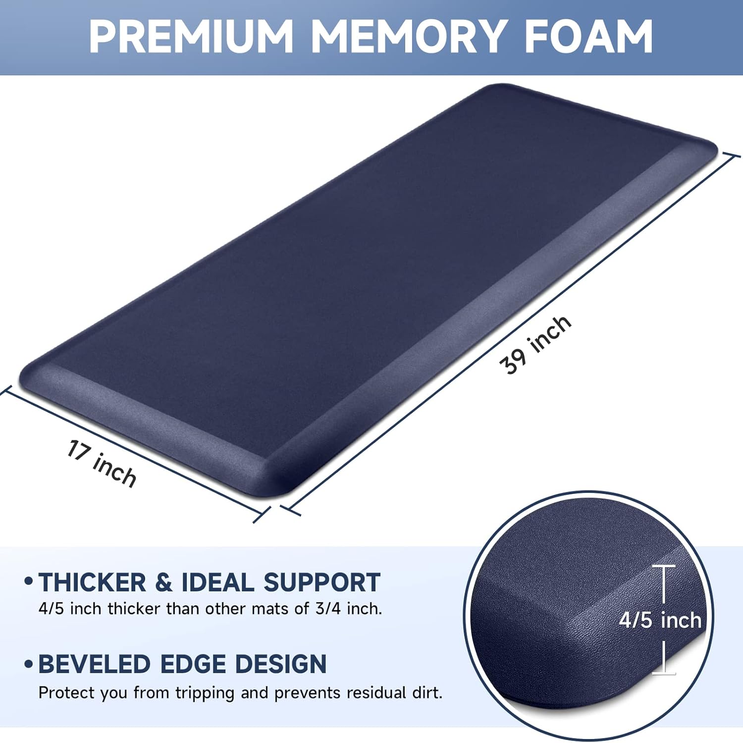 - ăThicker MatăThe StepRite kitchen mat is made of 4/5 inch thick memory foam for better support and comfort when standing. Measured as 17*39 inches. Suitable for kitchen, office, laundry room or any high-traffic area.